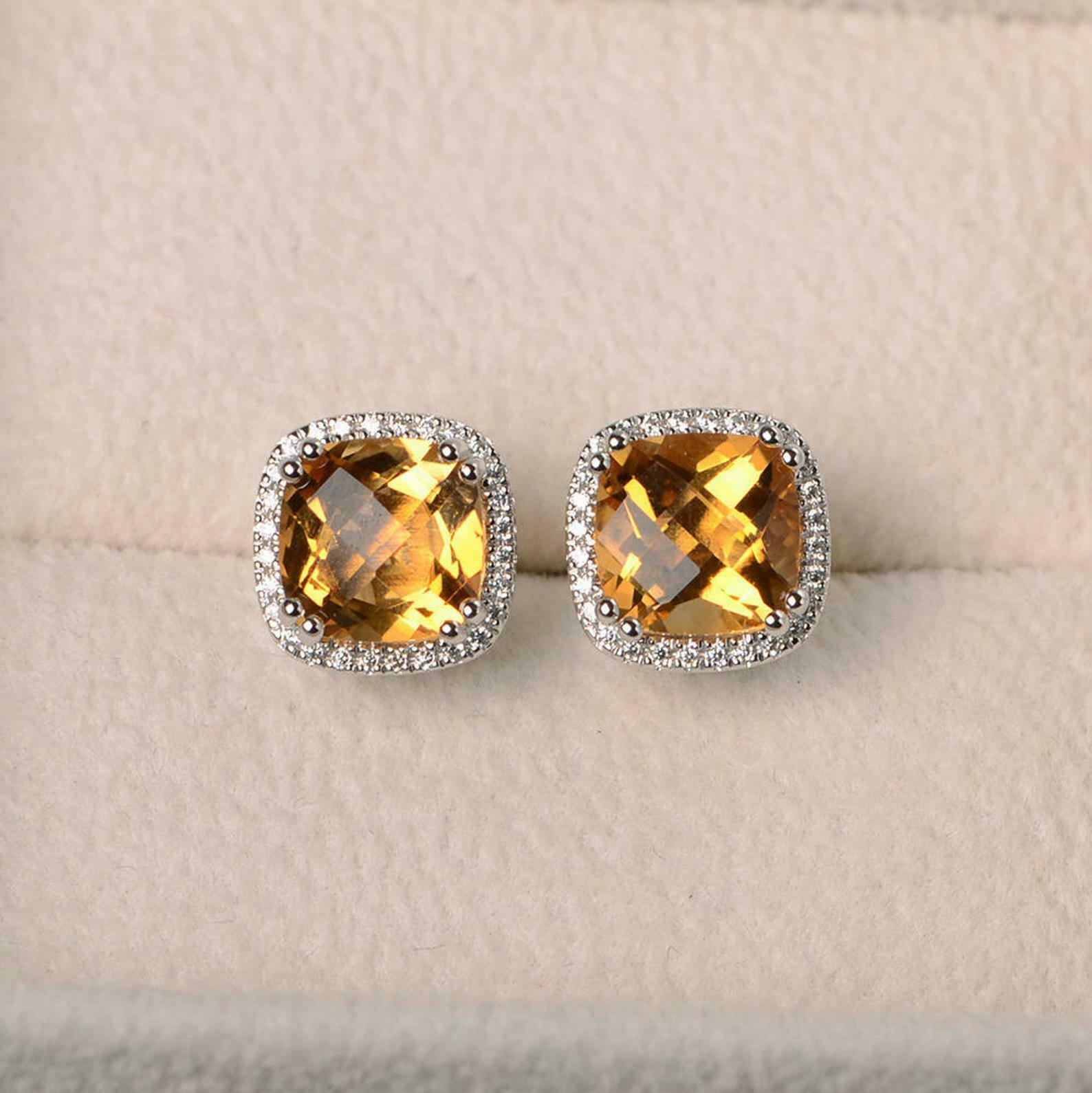 2ct Cushion Cut Yellow Citrine Diamond Halo Stud Earrings 14k White Gold Finish