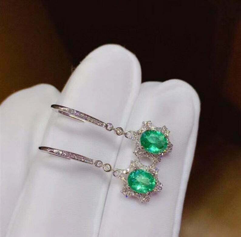 2ct Dangle Earrings Oval Cut Green Emerald Starry Dangling 14k White Gold Finish