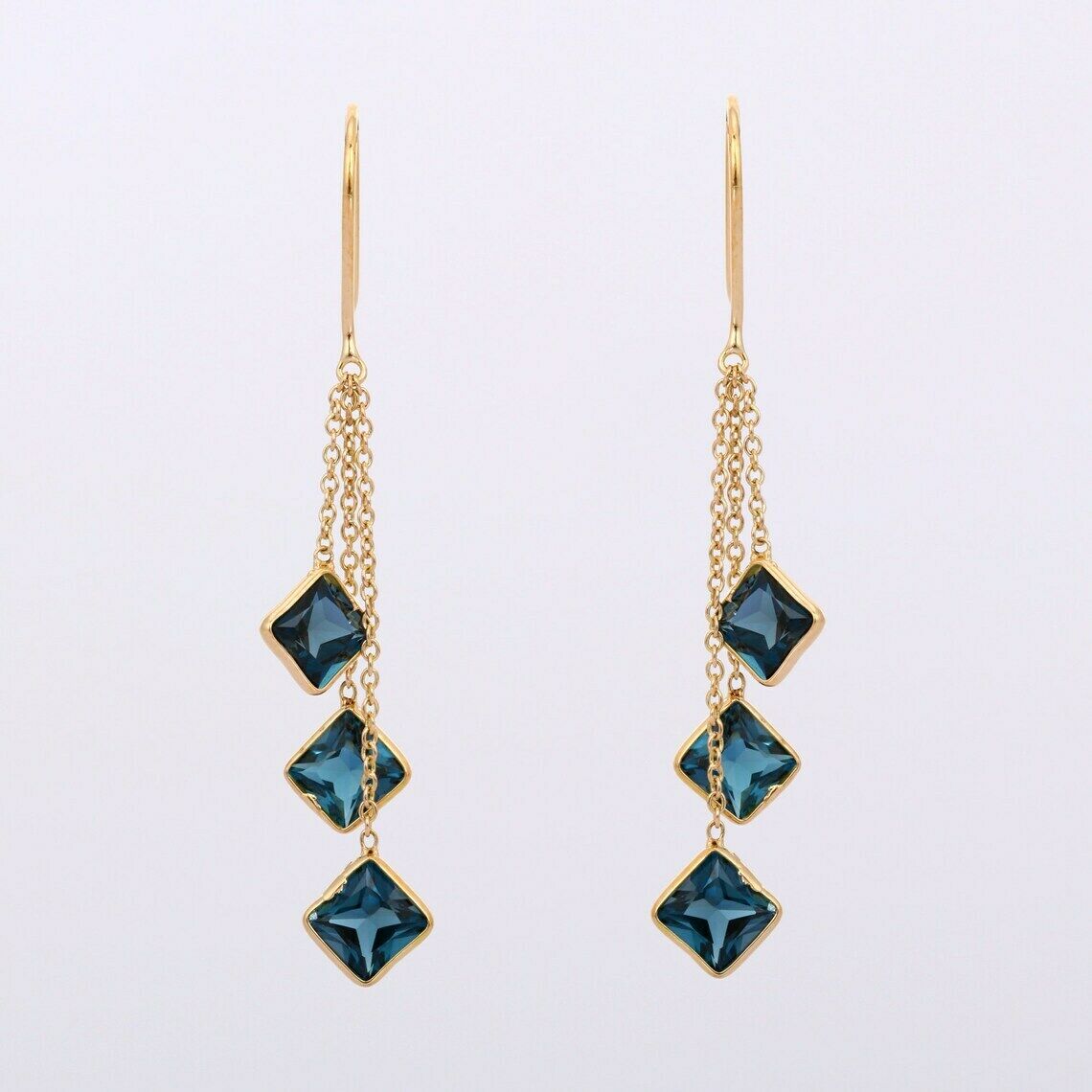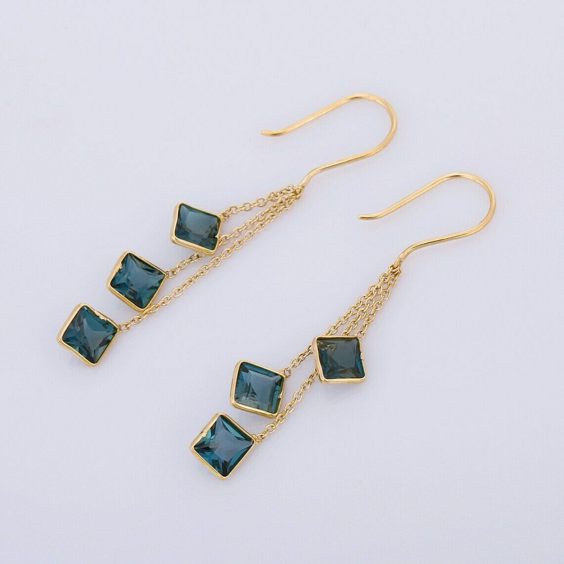 2ct Drop Earrings Cushion London Blue Topaz Dangling Chain 14k Yellow Gold Over