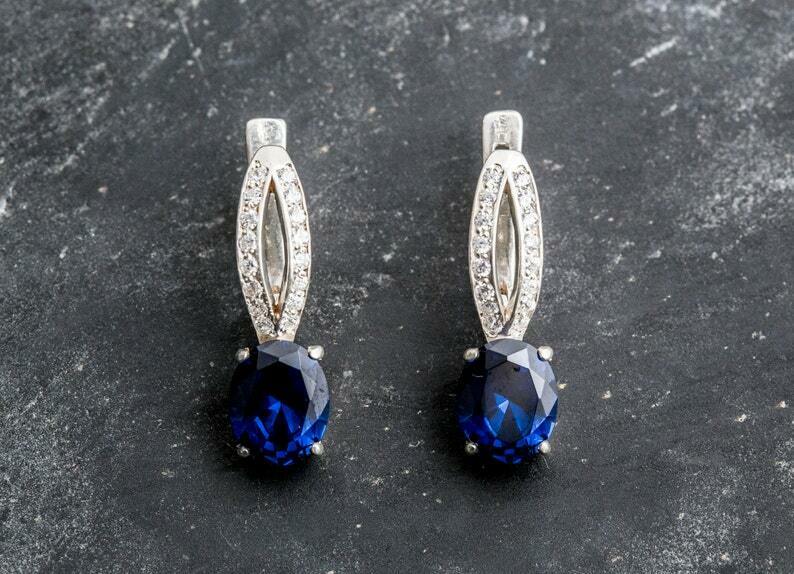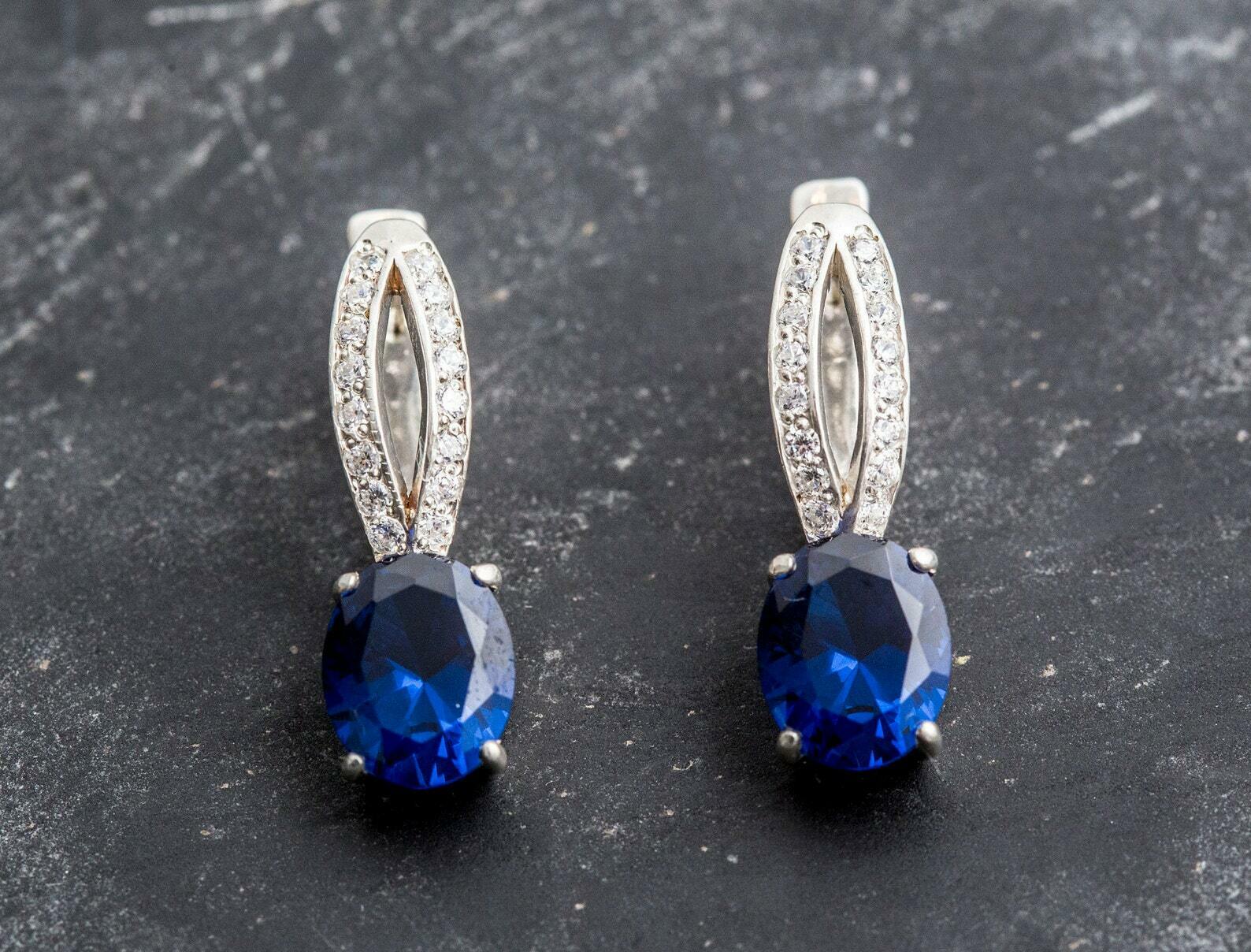 2ct Drop Earrings Oval Cut Blue Sapphire Split Design 14k White Gold Finish