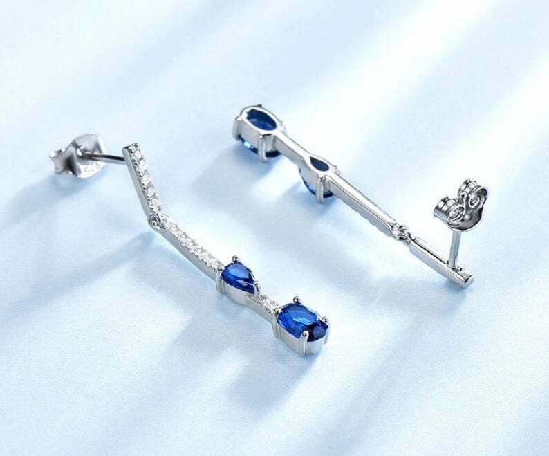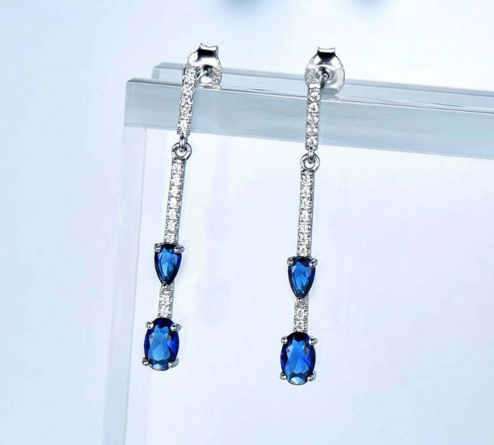 2ct Drop Earrings Oval Pear Cut Blue Sapphire Dangling Bar 14k White Gold Finish