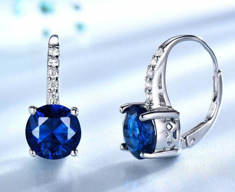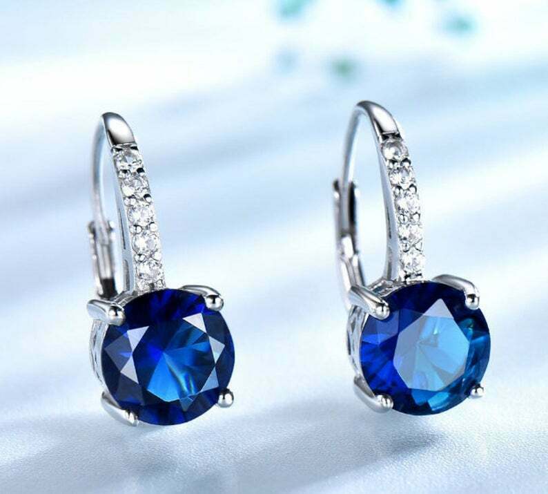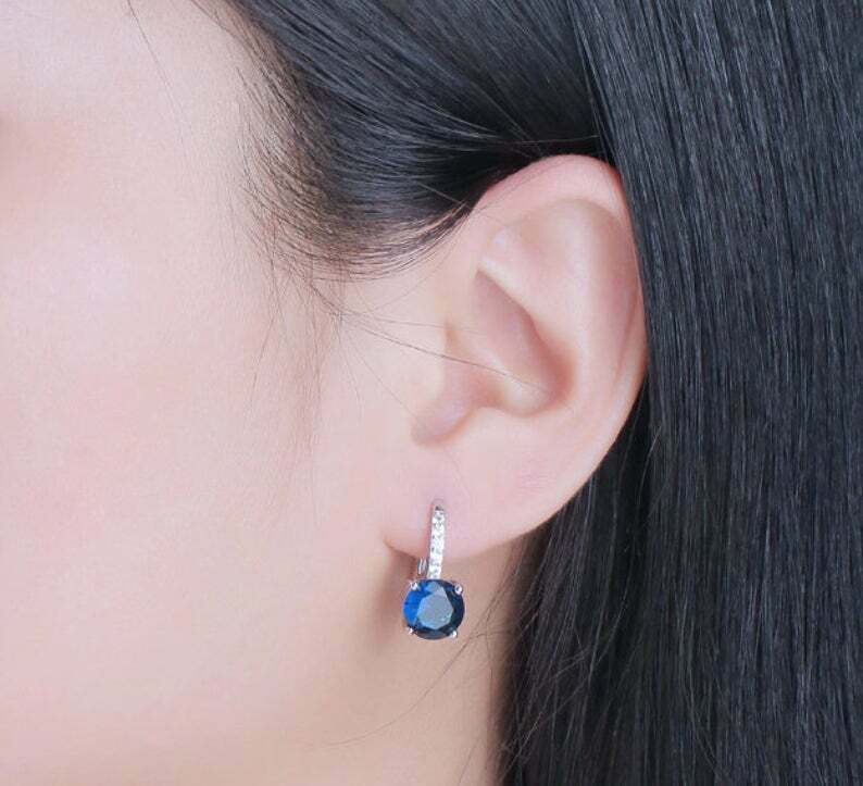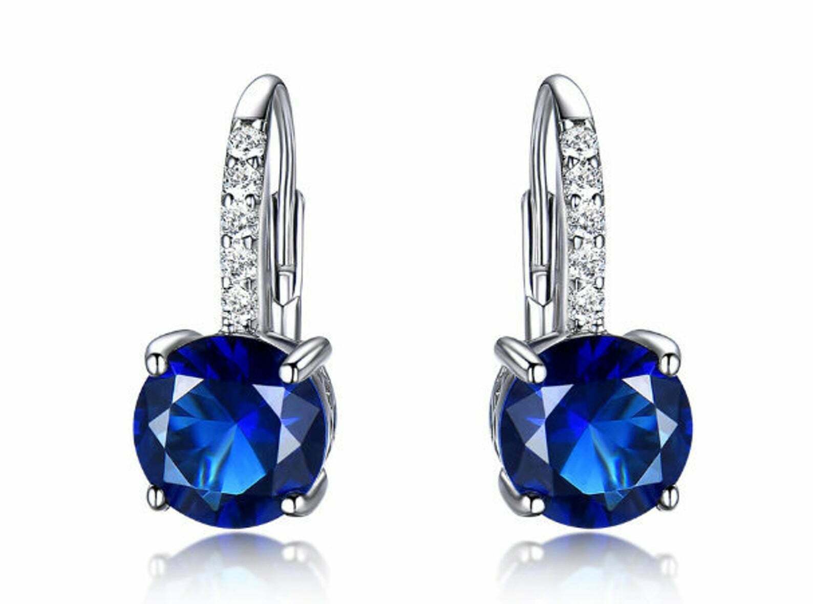 2ct Drop Earrings Round Cut Blue Sapphire Dangling Stylish 14k White Gold Finish