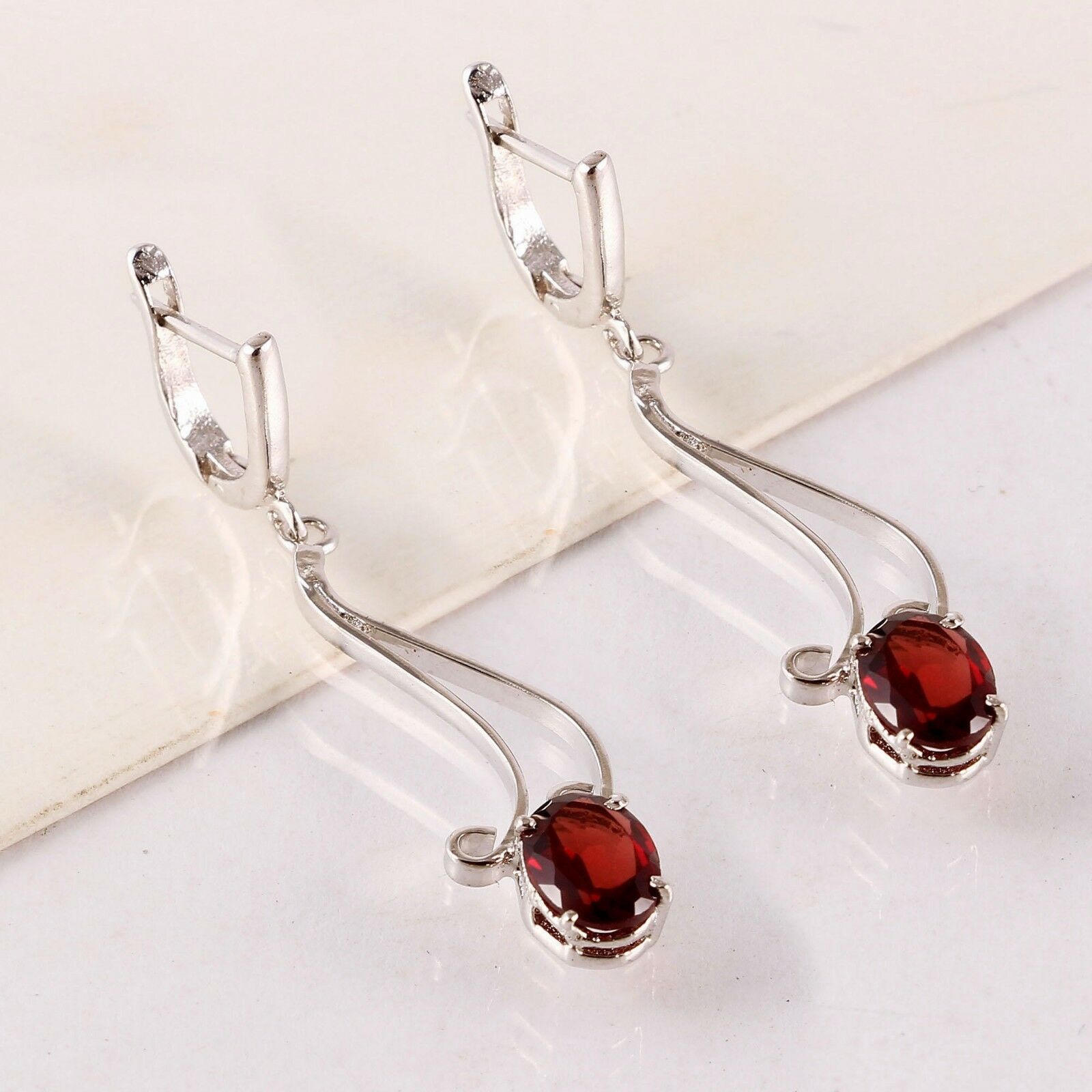 2ct Oval Cut Red Garnet Hanging LeverBack Drop Earrings 14k White Gold Finish