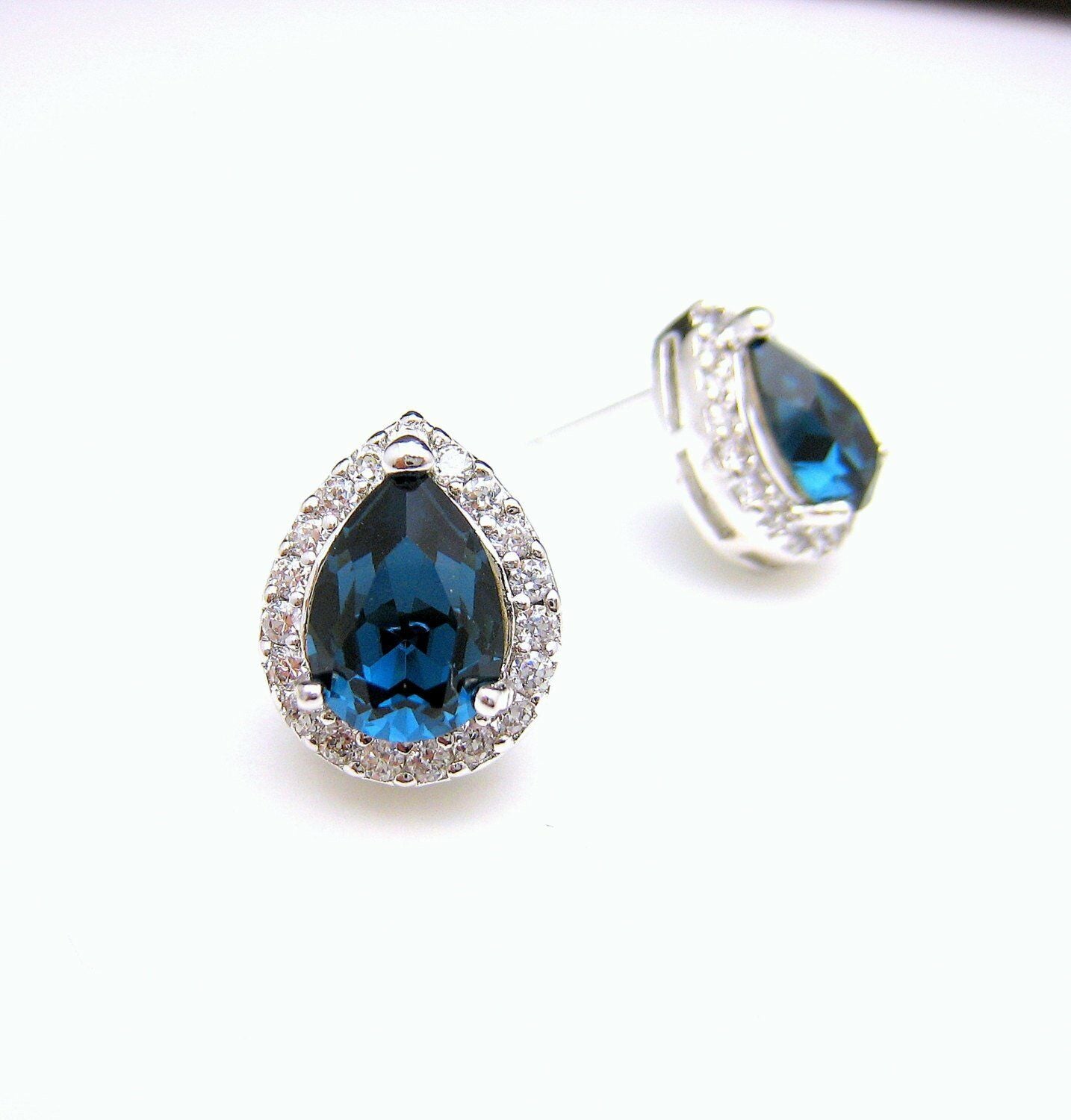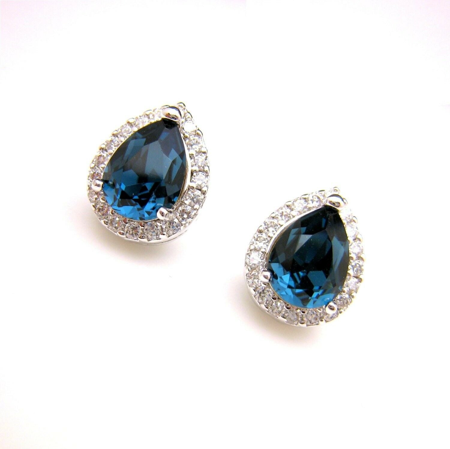2ct Pear Cut Blue Sapphire Halo Solitaire Stud Earrings 14k White Gold Finish