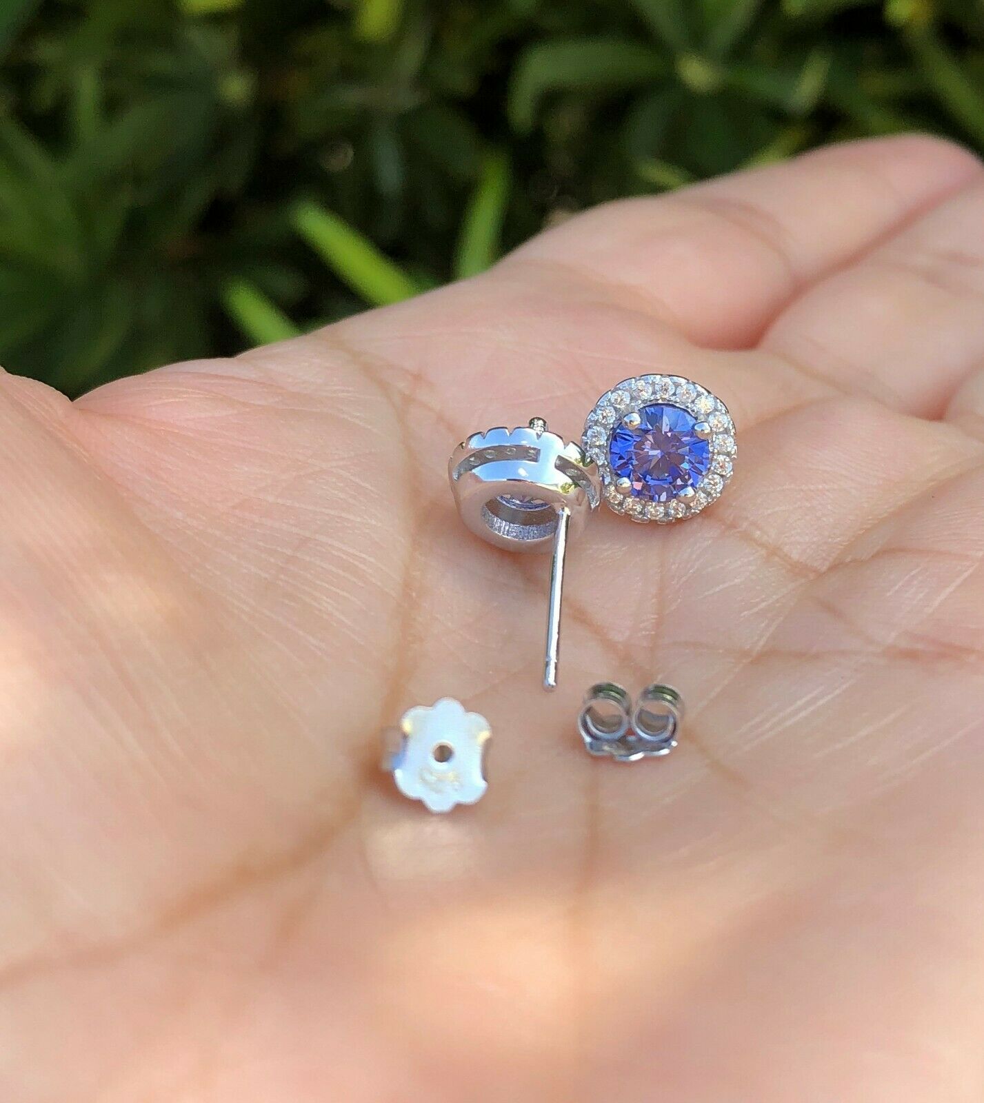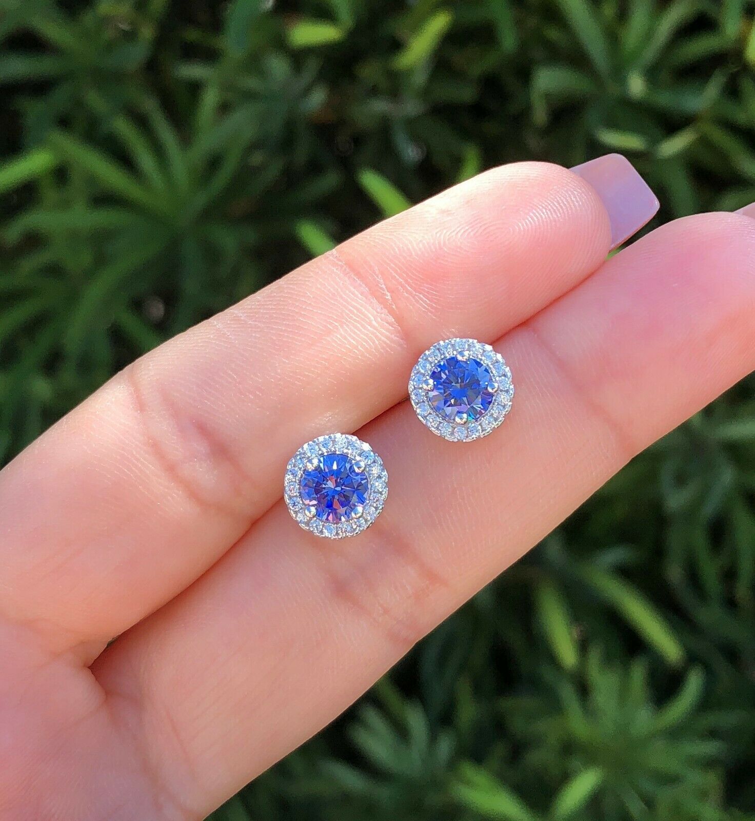 2Ct Round Cut Blue Tanzanite Diamond Halo Stud Earrings 14K White Gold Finish