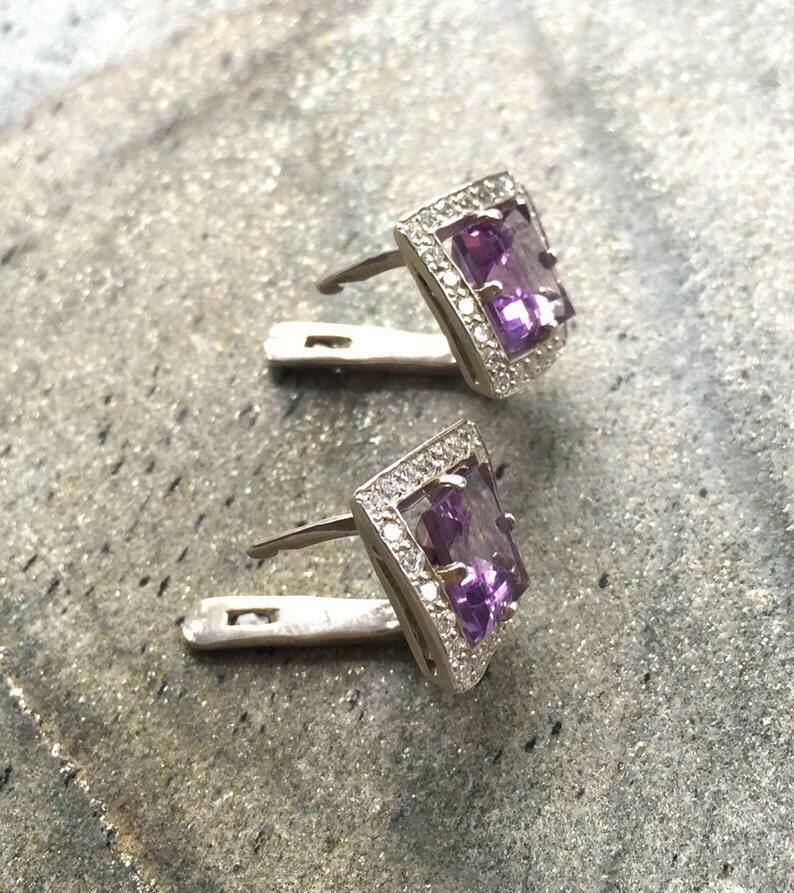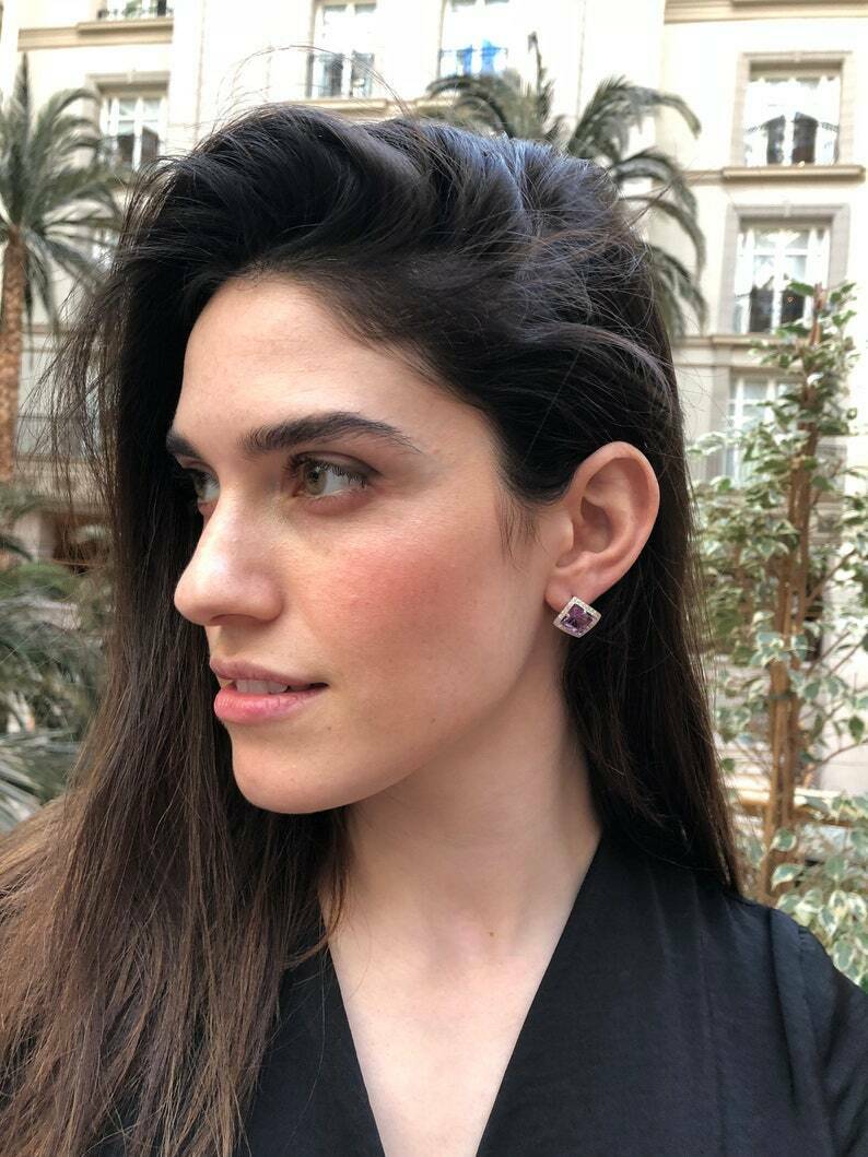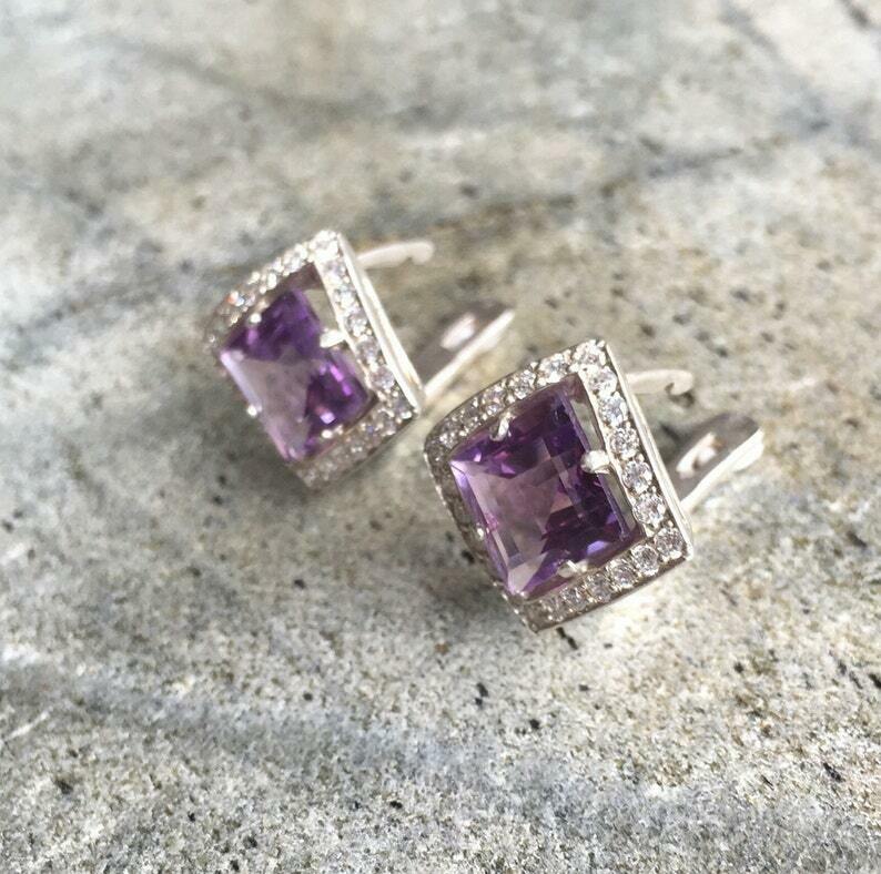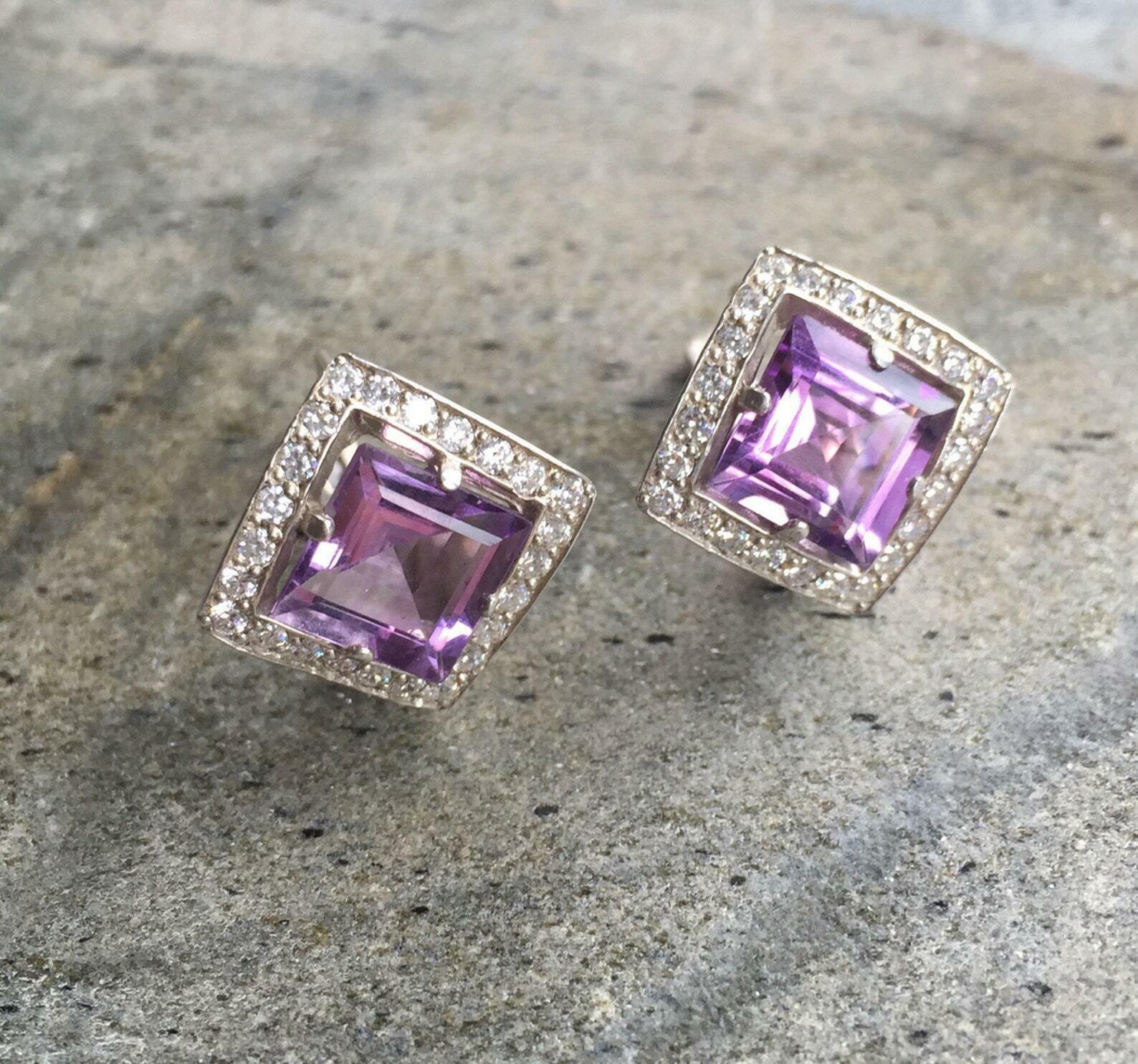 2ct Stud Earrings Asscher Cut Purple Amethyst Diamond Halo 14k White Gold Finish