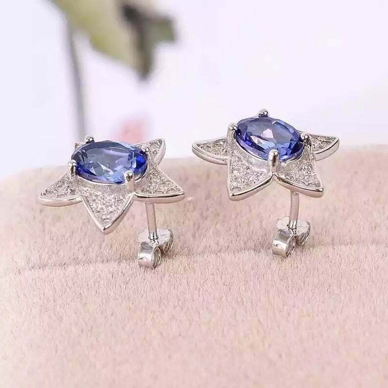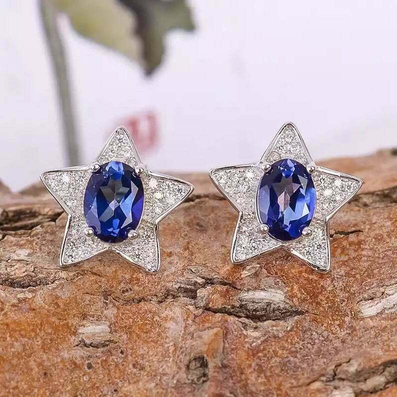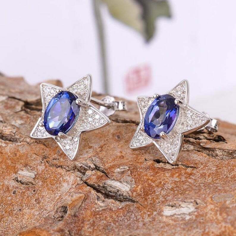2ct Stud Earrings Oval Cut Blue Sapphire Star Cluster 14k White Gold Finish