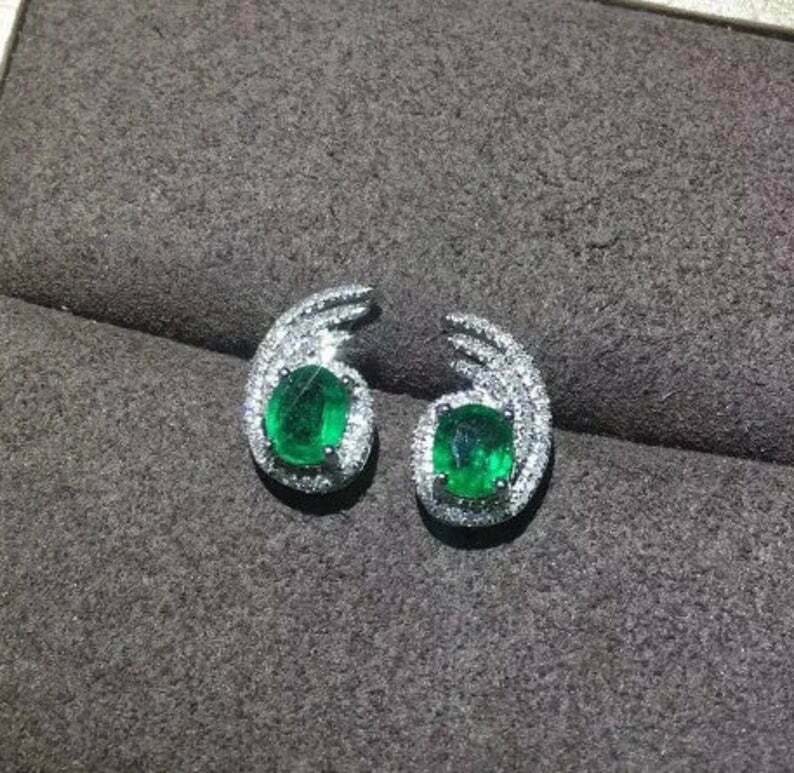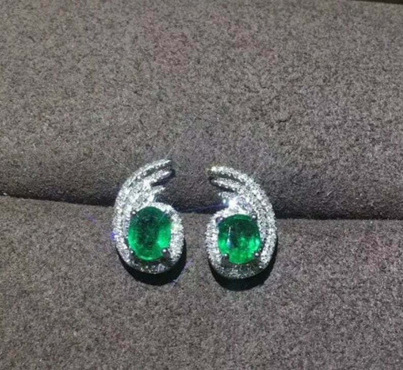 2ct Stud Earrings Oval Cut Green Emerald Halo Design 14k White Gold Finish