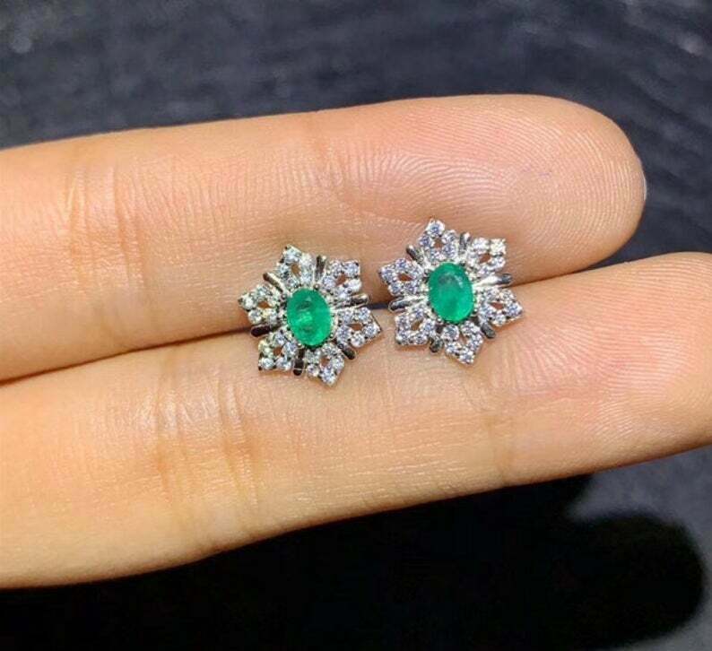2ct Stud Earrings Oval Cut Green Emerald Snowflake Flower 14k White Gold Finish