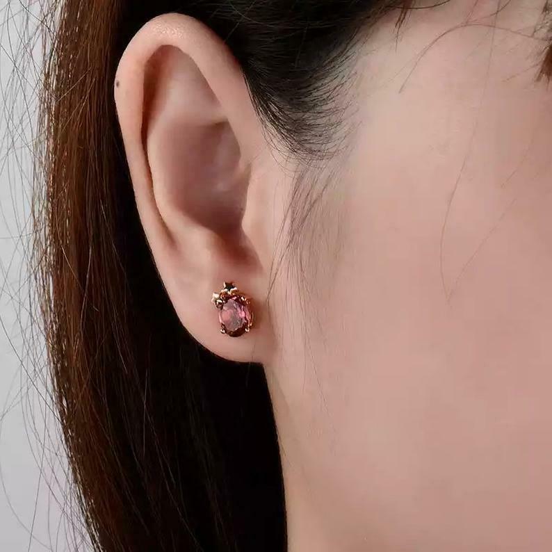 2ct Stud Earrings Oval Cut Pink Ruby Two Star Design 14k Rose Gold Finish