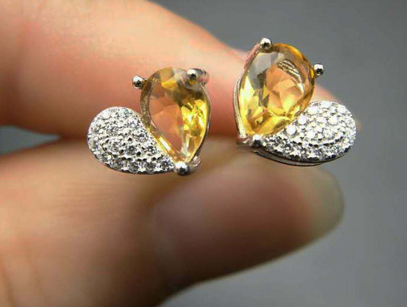 2ct Stud Earrings Pear Cut Yellow Citrine Studded Heart 14k White Gold Finish