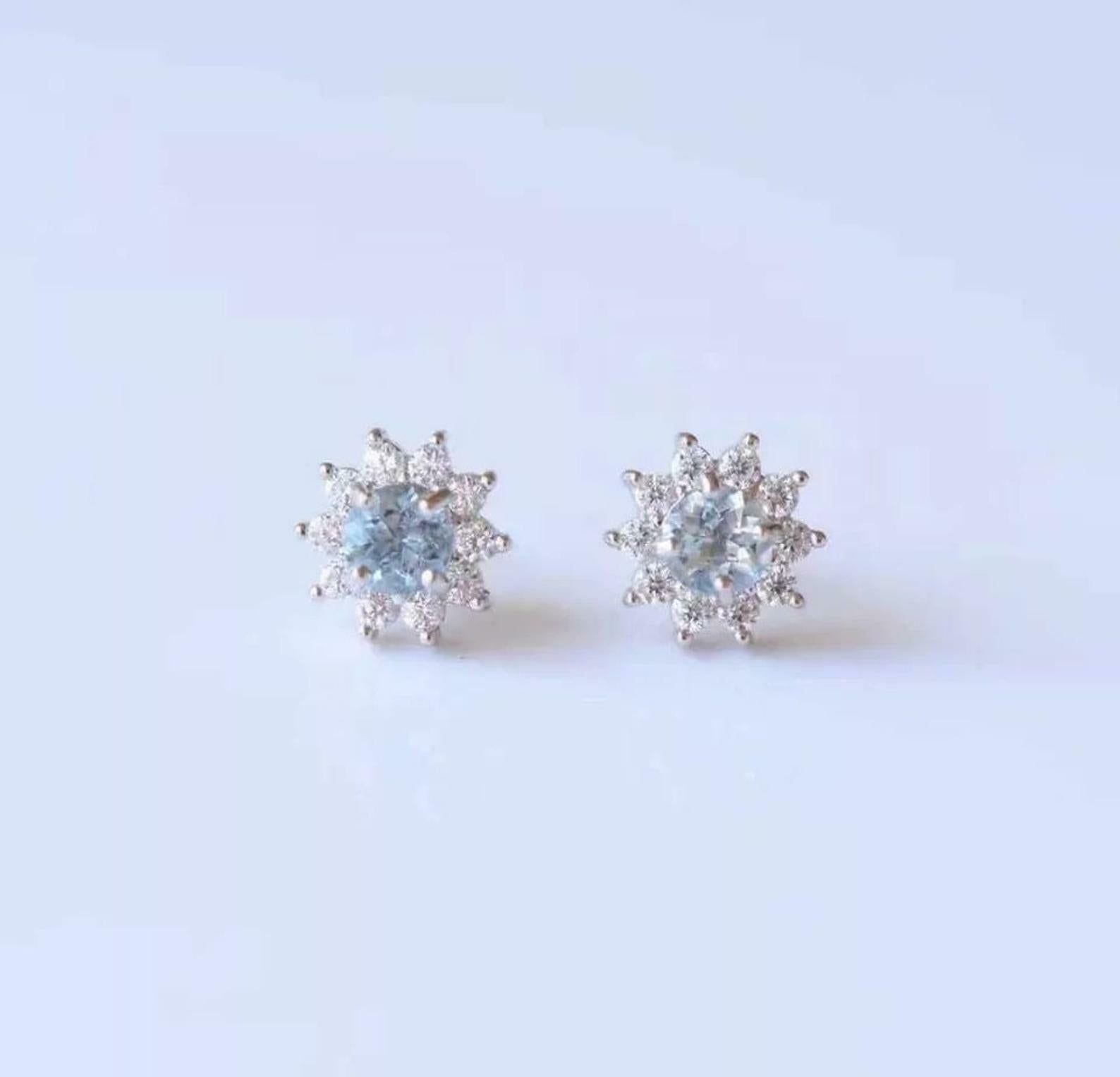 2ct Stud Earrings Round Cut Blue Aquamarine Diamond Floral 14k White Gold Finish