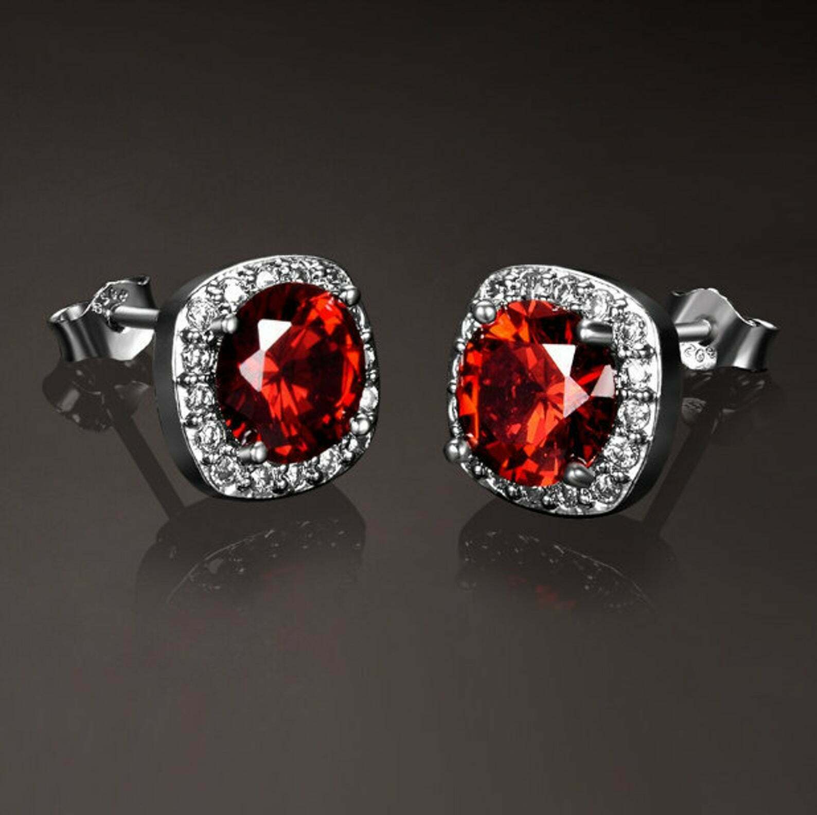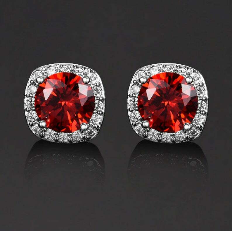 2ct Stud Earrings Round Cut Red Garnet Diamond Halo 14k White Gold Finish