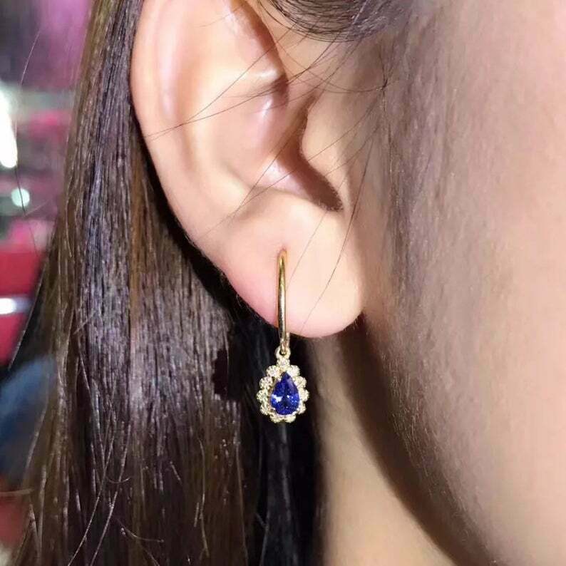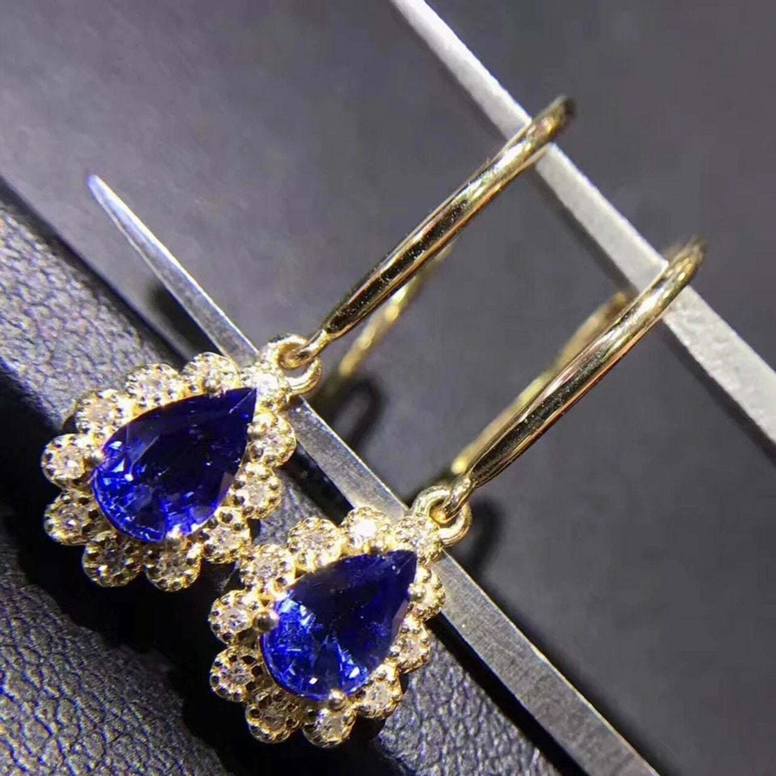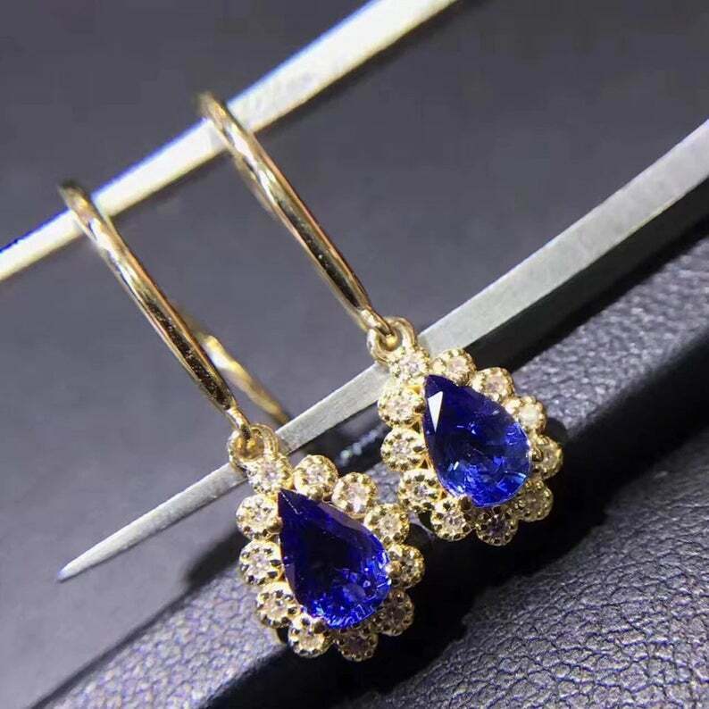 3.4ct Drop Earrings Pear Cut Blue Tanzanite Diamond Halo 14k Yellow Gold Finish