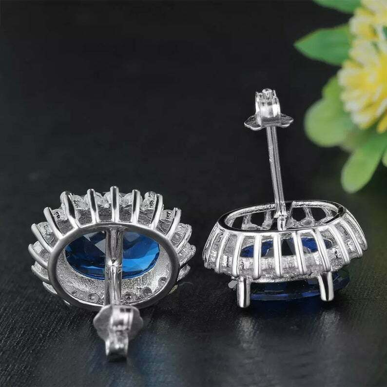 4ct Stud Earrings Oval Cut Blue Sapphire Diamond Halo Floral 14k White Gold Over