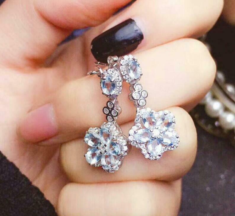 5ct Drop Earrings Oval Cut Blue Aquamarine Floral Cocktail 14k White Gold Finish