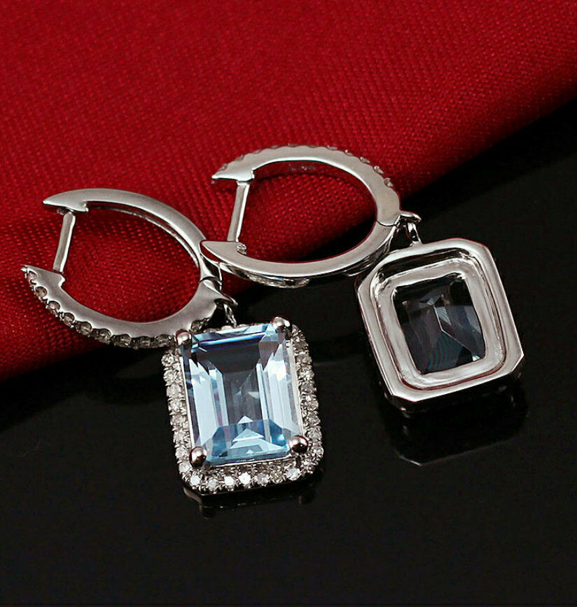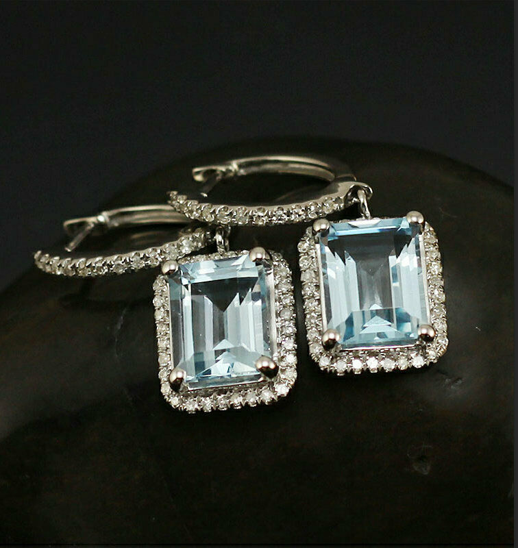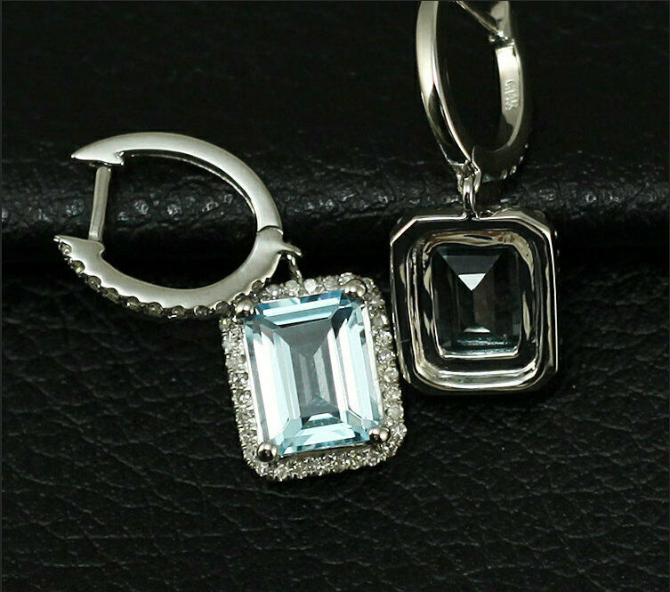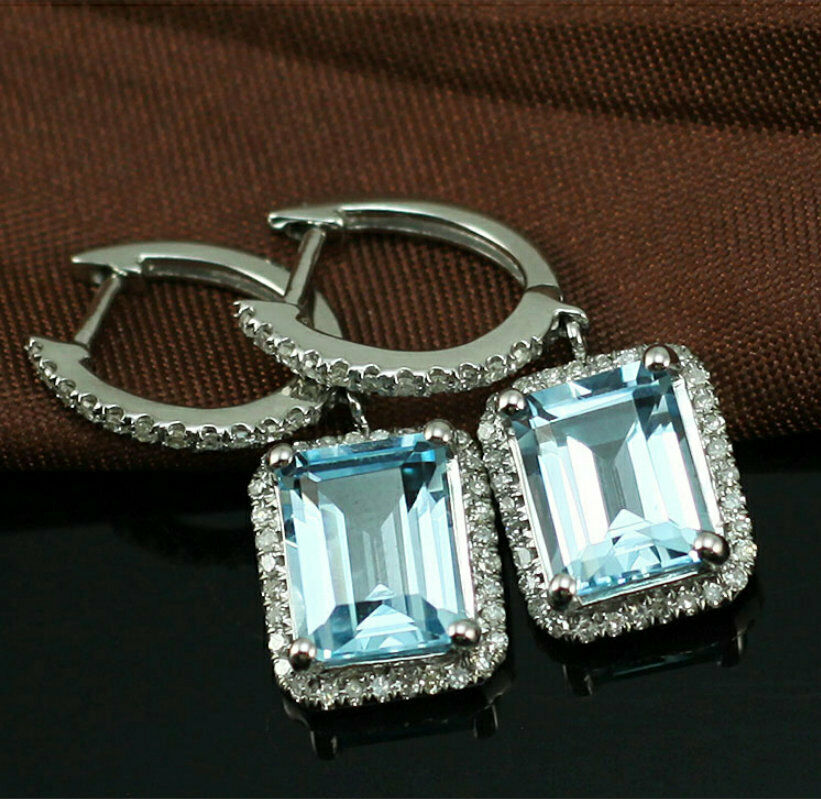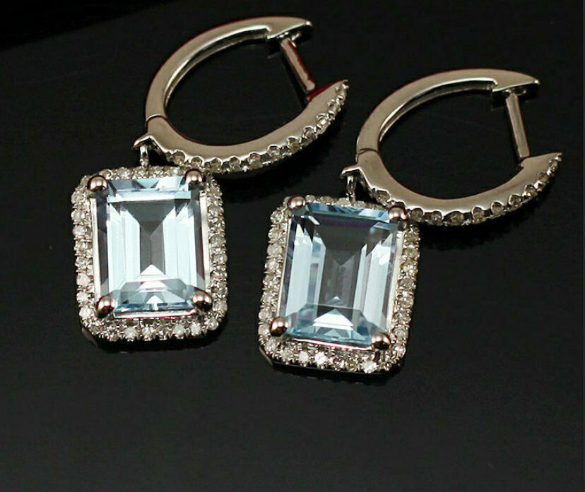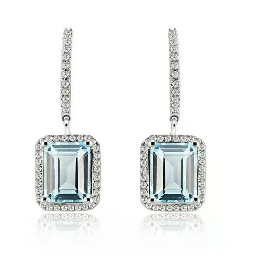 5Ct Emerald Cut Blue Aquamarine Diamond Halo Drop Earrings 14K White Gold Finish