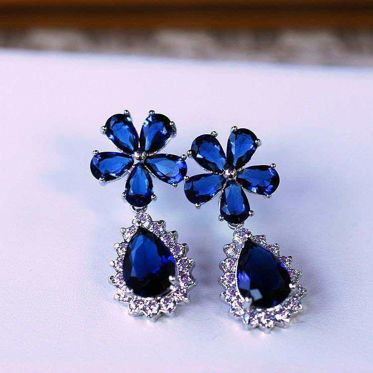 5ct Pear Cut Blue Sapphire Halo Pear Shape Drop Earrings 14k White Gold Finish