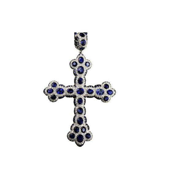 6Ct Oval Cut Blue Sapphire Diamond Halo Iced Cross Pendant 14K White Gold Finish