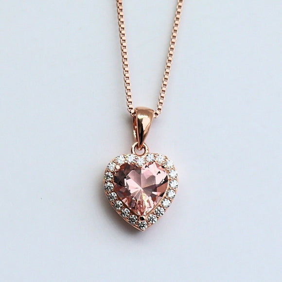 2Ct Heart Cut Peach Morganite Diamond Halo Pendant 14K Rose Gold Finish NO CHAIN