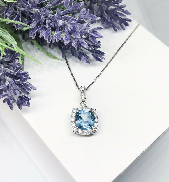 1.5Ct Cushion Cut Blue Aquamarine Halo Pendant 18K White Gold Finish NO CHAIN