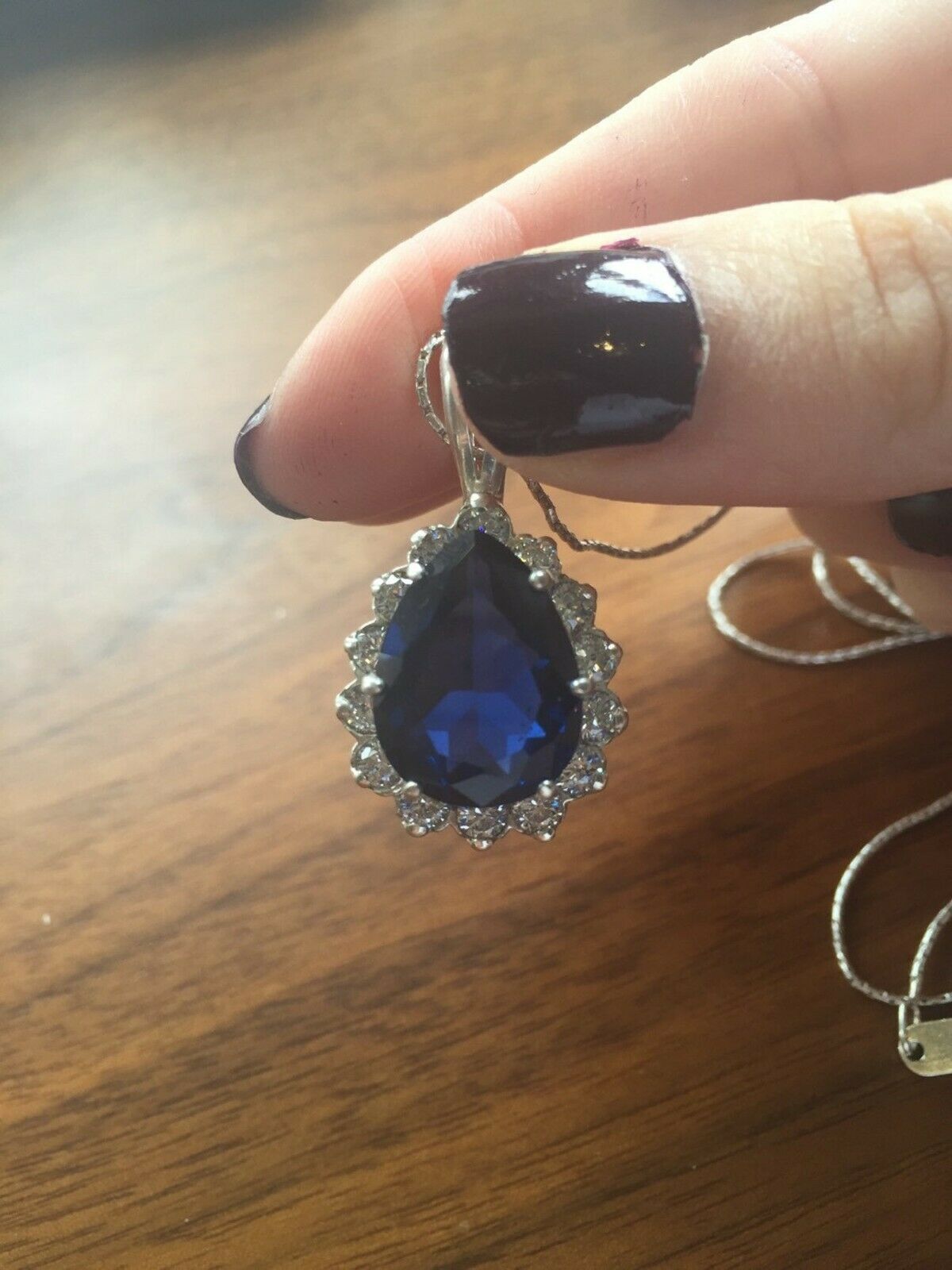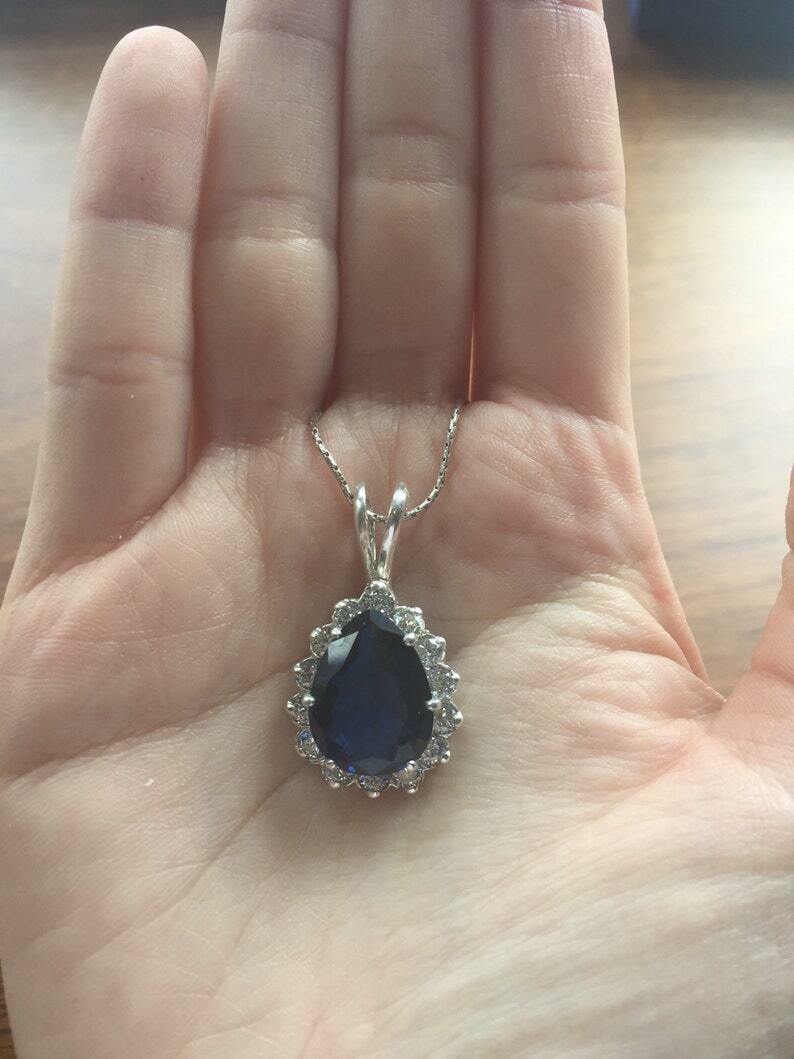 1.6ct Blue Sapphire Pendant Pear Cut Diamond Halo 14k White Gold Finish NO CHAIN