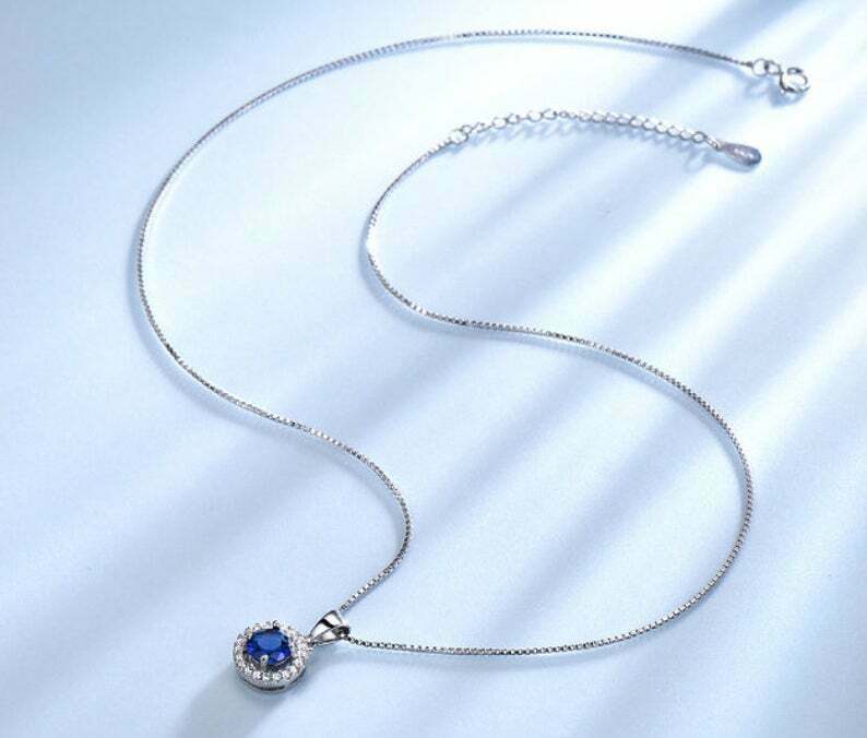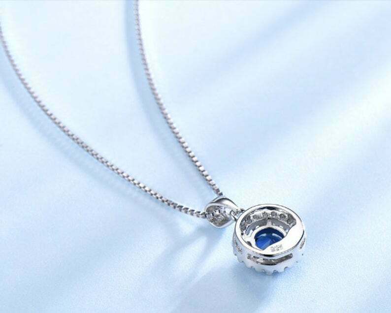 1ct Blue Sapphire Pendant Round Cut Diamond Halo 14k White Gold Finish NO CHAIN