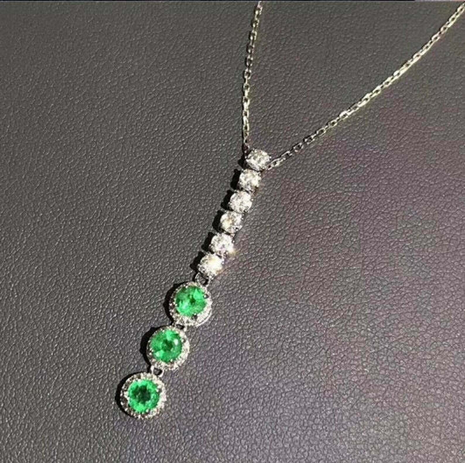 1ct Green Emerald Pendant with Chain Round Cut Vertical Bar 14k White Gold Over