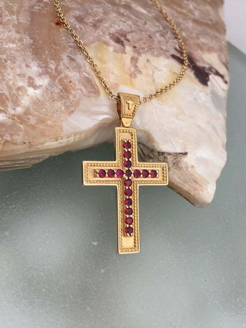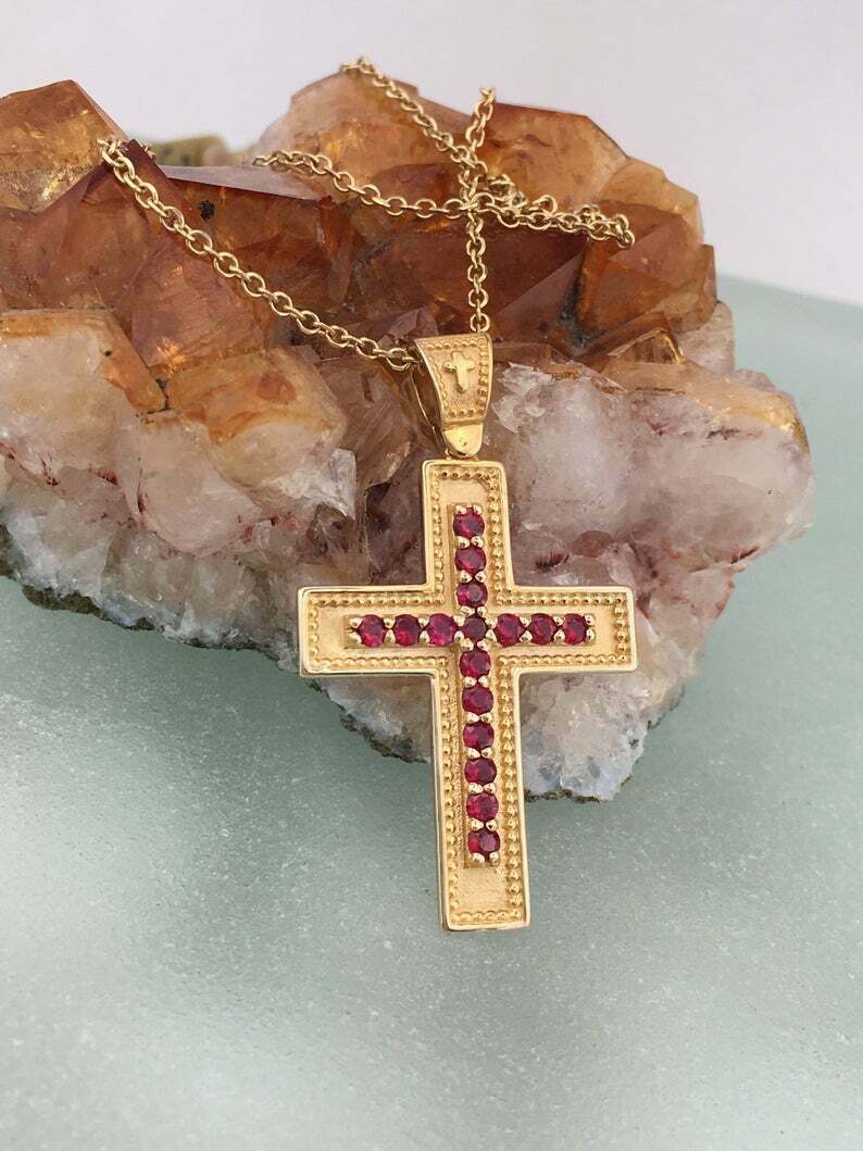 1ct Round Cut Pink Ruby Pendant with Chain Milgrain Cross 14k Yellow Gold Finish