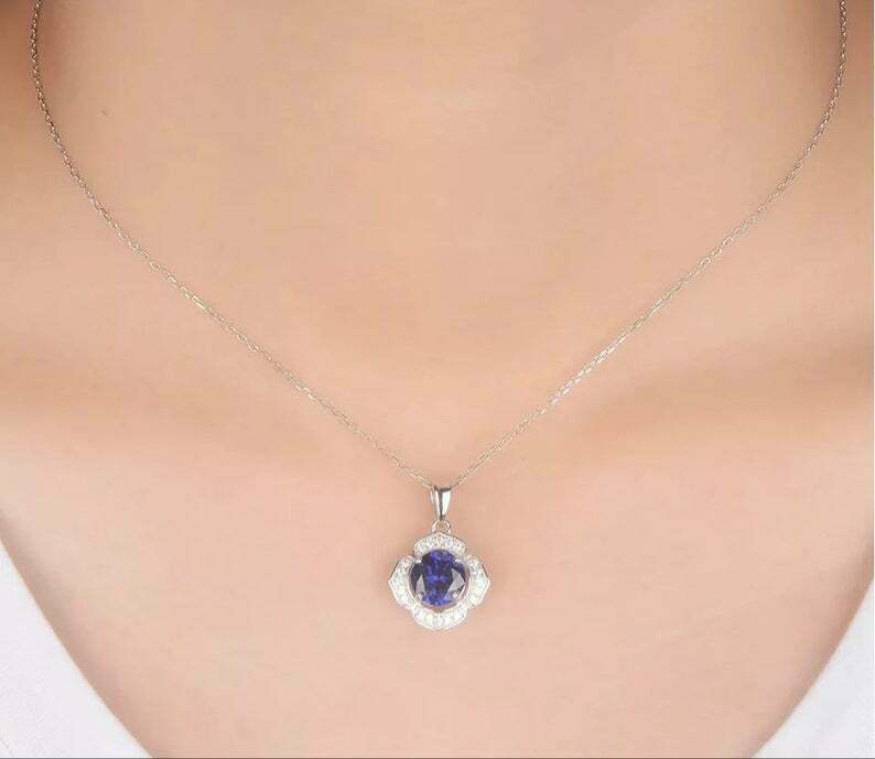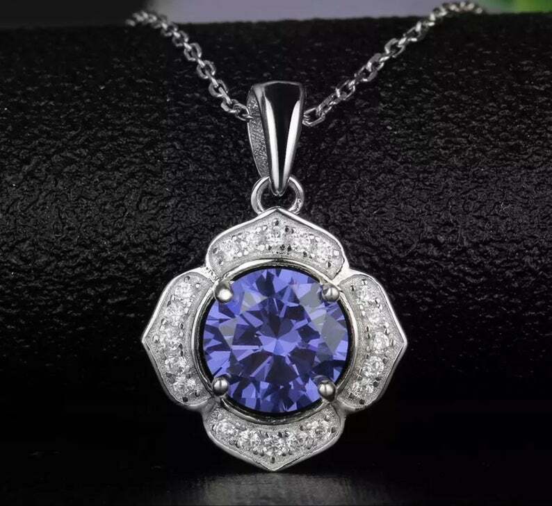 2.3ct Blue Tanzanite Pendant with Chain Round Cut Floral 14k White Gold Finish