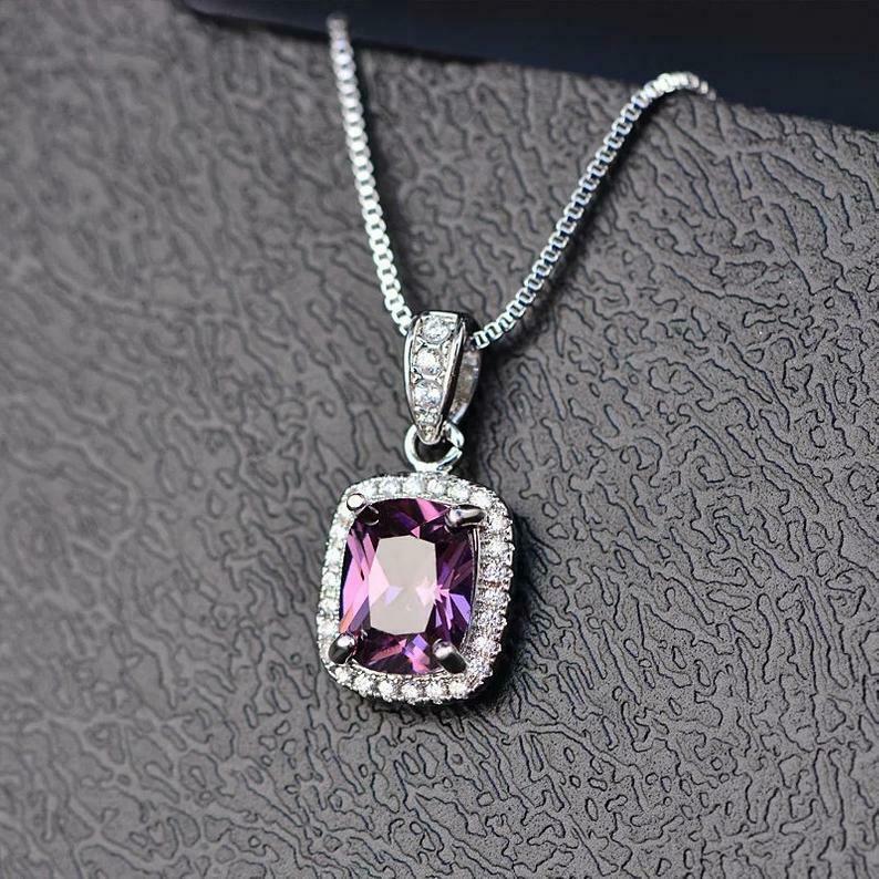 2.5ct Purple Amethyst Pendant Cushion Cut Diamond Halo 14k White Gold Finish NO CHAIN