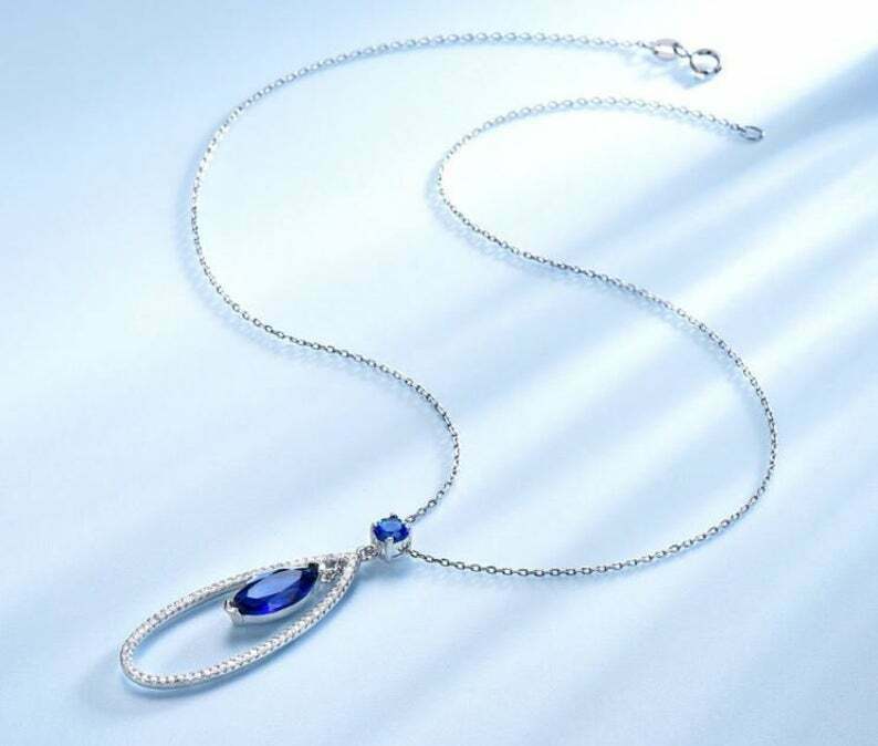 2.6ct Sapphire Pendant Chain Marquise Cut Dangle Cocktail 14k White Gold Finish