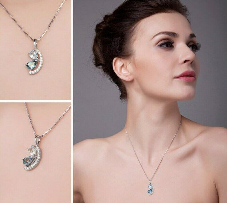 2ct Blue Aquamarine Pendant Pear Cut Stylish 14k White Gold Finish NO CHAIN