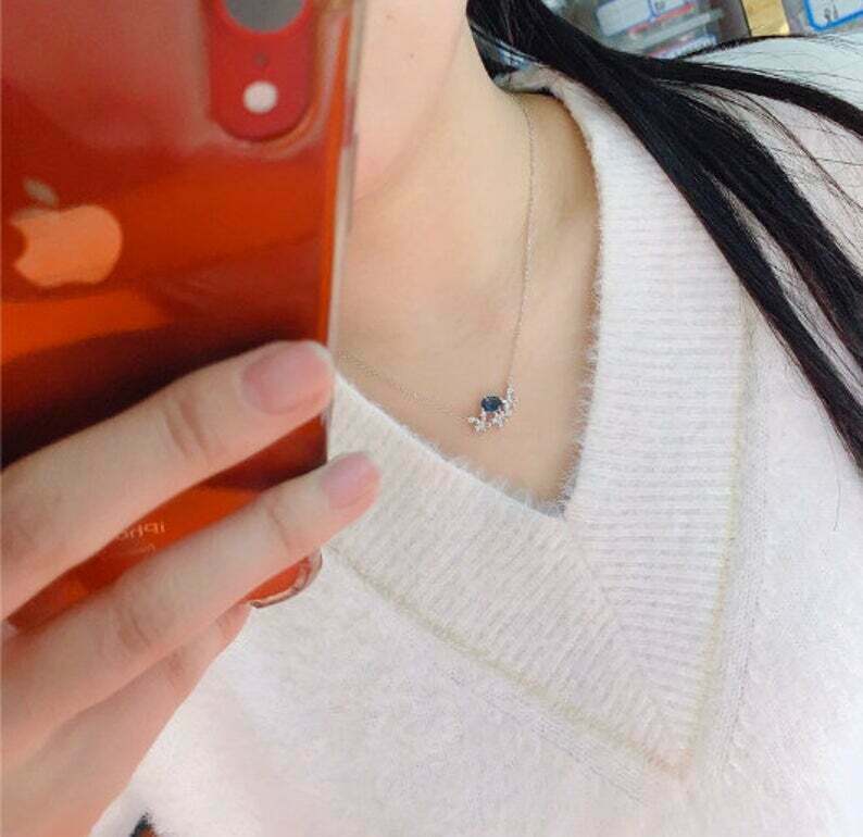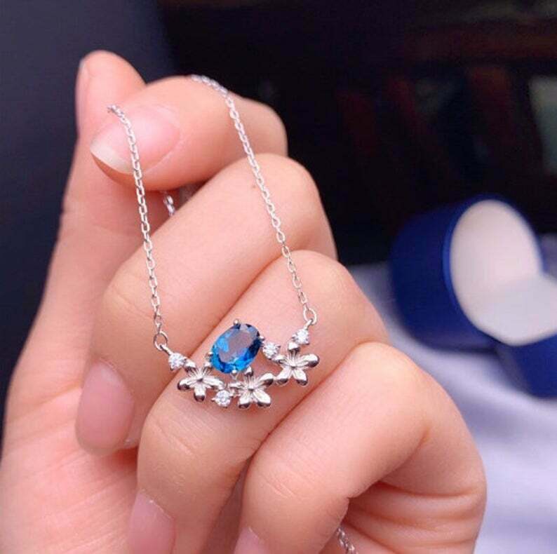 2ct Blue Sapphire Pendant with Chain Oval Cut Floral 14k White Gold Finish