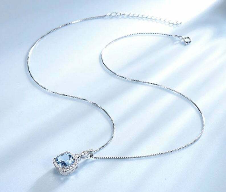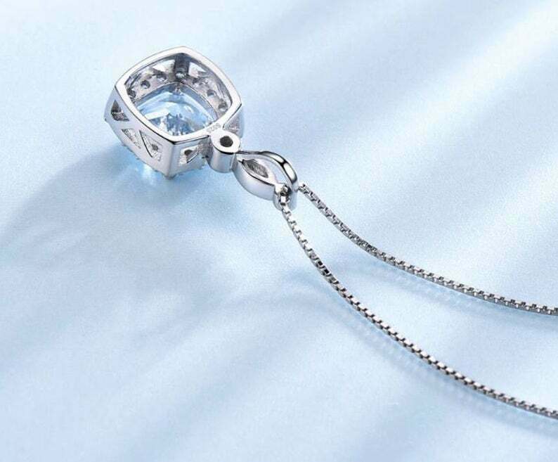2ct Blue Topaz Pendant Cushion Cut Diamond Halo 14k White Gold Finish NO CHAIN