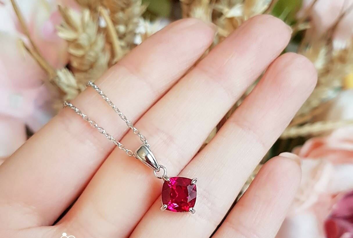 2ct Cushion Cut Pink Ruby Pendant with Chain Solitaire 14k White Gold Finish
