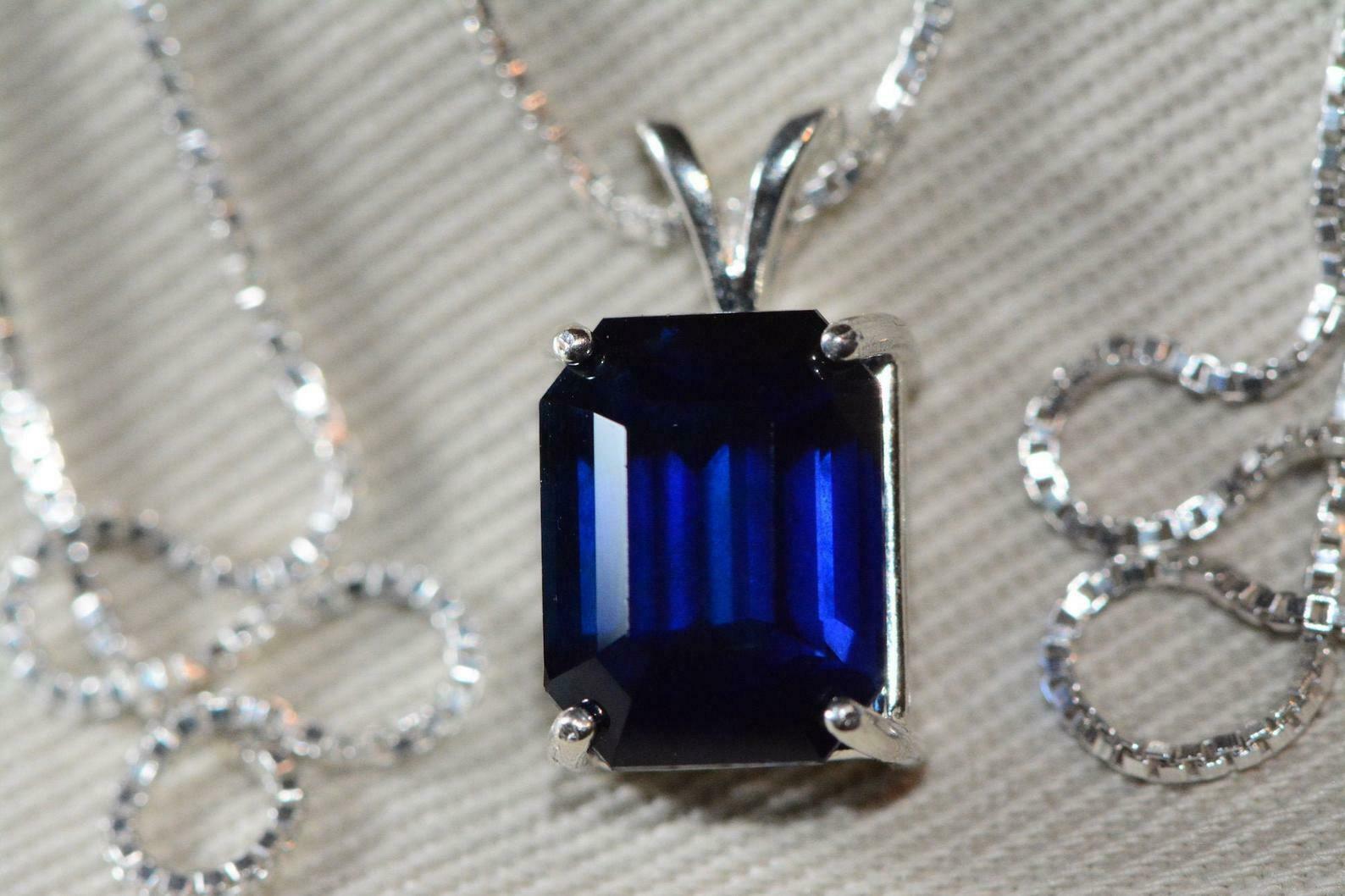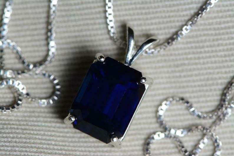 5ct Blue Sapphire Pendant Emerald Cut Solitaire 14k White Gold Finish NO CHAIN