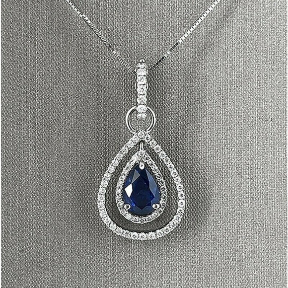 1.5ct Pear Cut Blue Sapphire Double Halo Pendant with Chain 14k White Gold Over