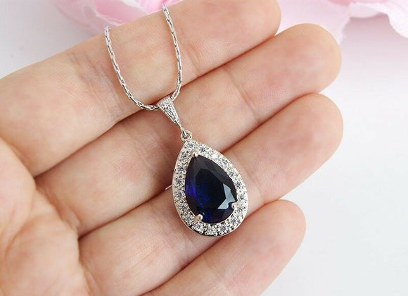 2ct Pear Cut Blue Sapphire Halo Tear Drop Pendant 14k White Gold Finish NO CHAIN