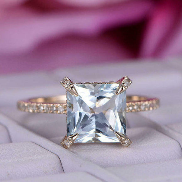 1ct Princess Cut Blue Aquamarine Engagement Ring Three Stone 14k RoseGold Finish