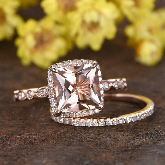 2ct Princess Cut Peach Morganite Engagement Ring Bridal Set 14k Rose Gold Finish