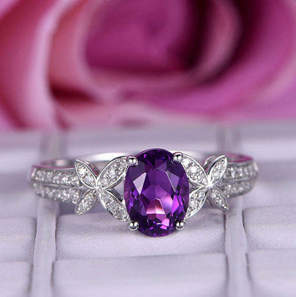 2ct Oval Cut Purple Amethyst Engagement Ring Butterfly Accent 14k WhiteGold Over
