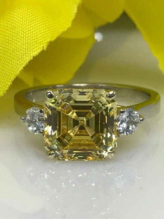 1.2ct Asscher Cut Yellow Sapphire 3 Stone Engagement Ring 14k White Gold Finish