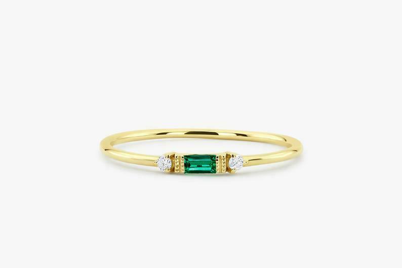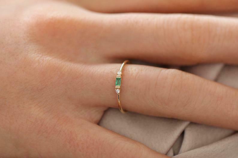 0.3ct Baguette Cut Green Emerald Minimalist Engagement Ring 14k Yellow Gold Over