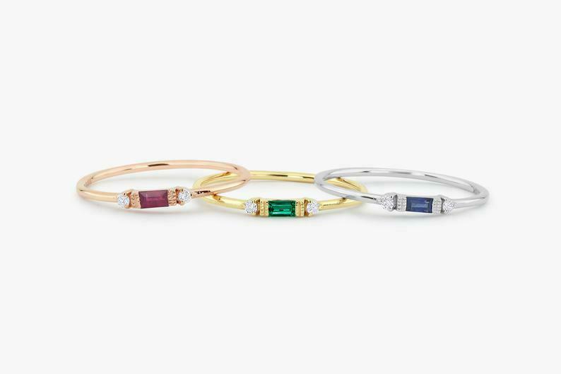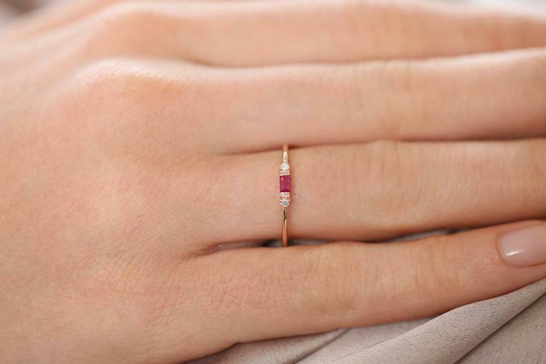 0.3ct Baguette Cut Pink Ruby Trilogy Minimalist Engagement Ring 14k Rose Gold Finish