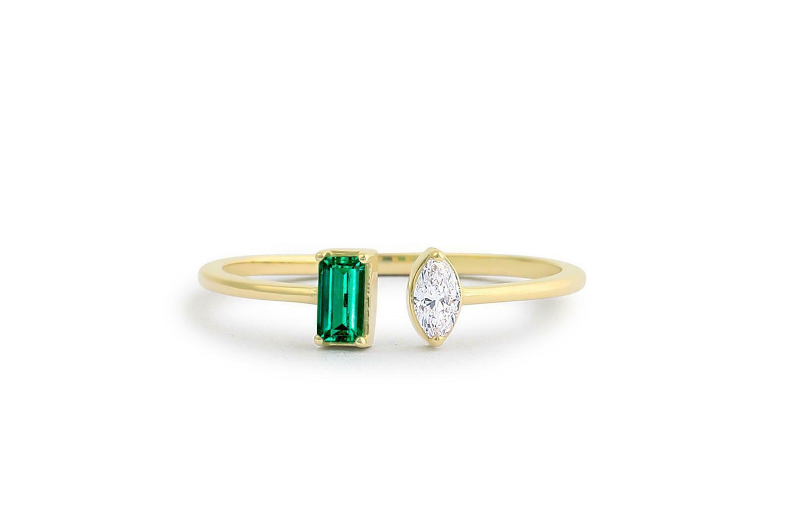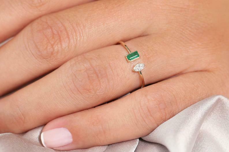 0.7ct Baguette Cut Green Emerald Open Cuff Stackable Engagement Ring 14k Yellow Gold Over