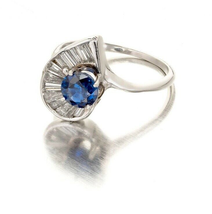 0.7ct Round Cut Blue Sapphire Engagement Ring Art Deco 14k White Gold Finish