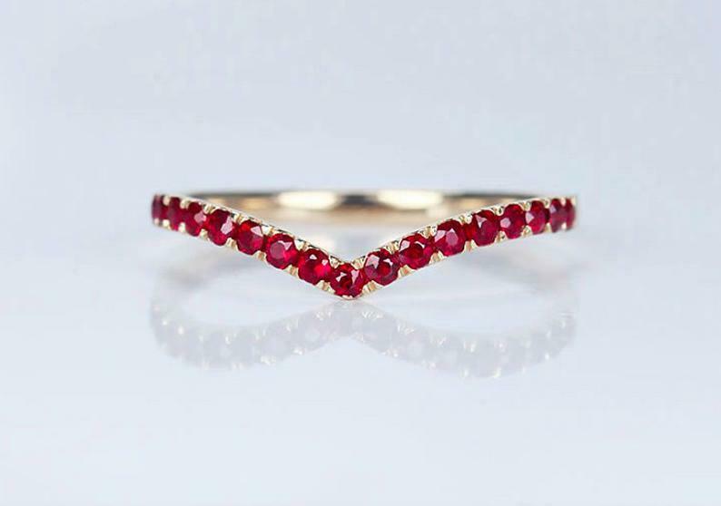 0.7ct Round Pink Ruby Wedding Band V Shaped Petite Curved 14k Yellow Gold Finish