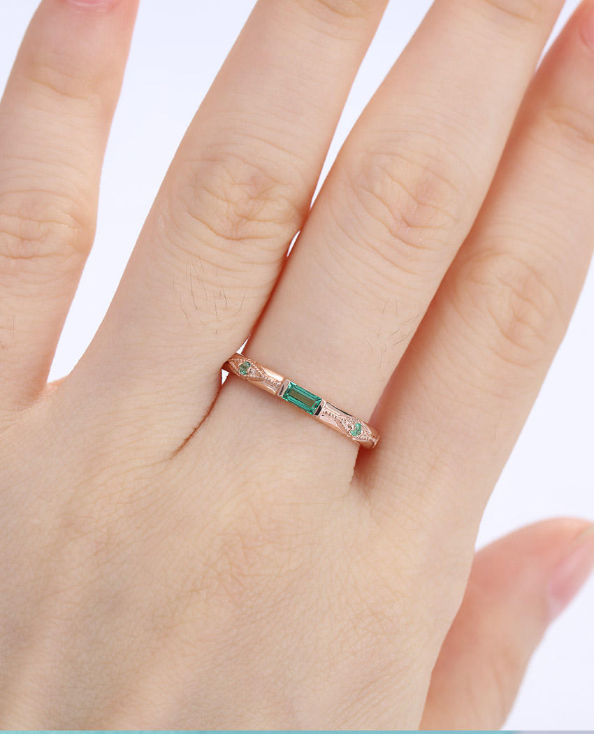 1.1ct Baguette Cut Green Emerald Minimalist Engagement Ring 14k Rose Gold Finish