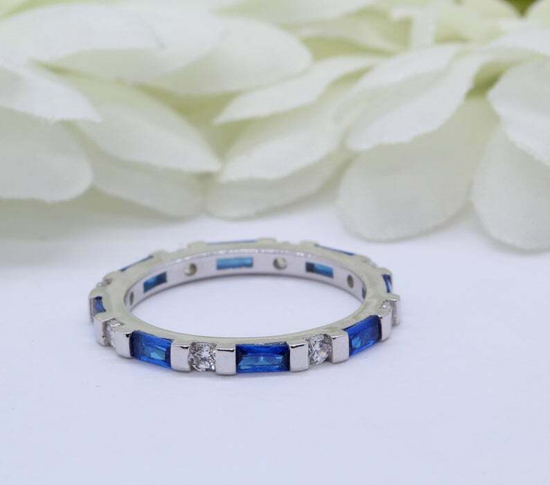 1.2ct Baguette Cut Blue Sapphire Wedding Band Eternity Stackable 14k White Gold Over